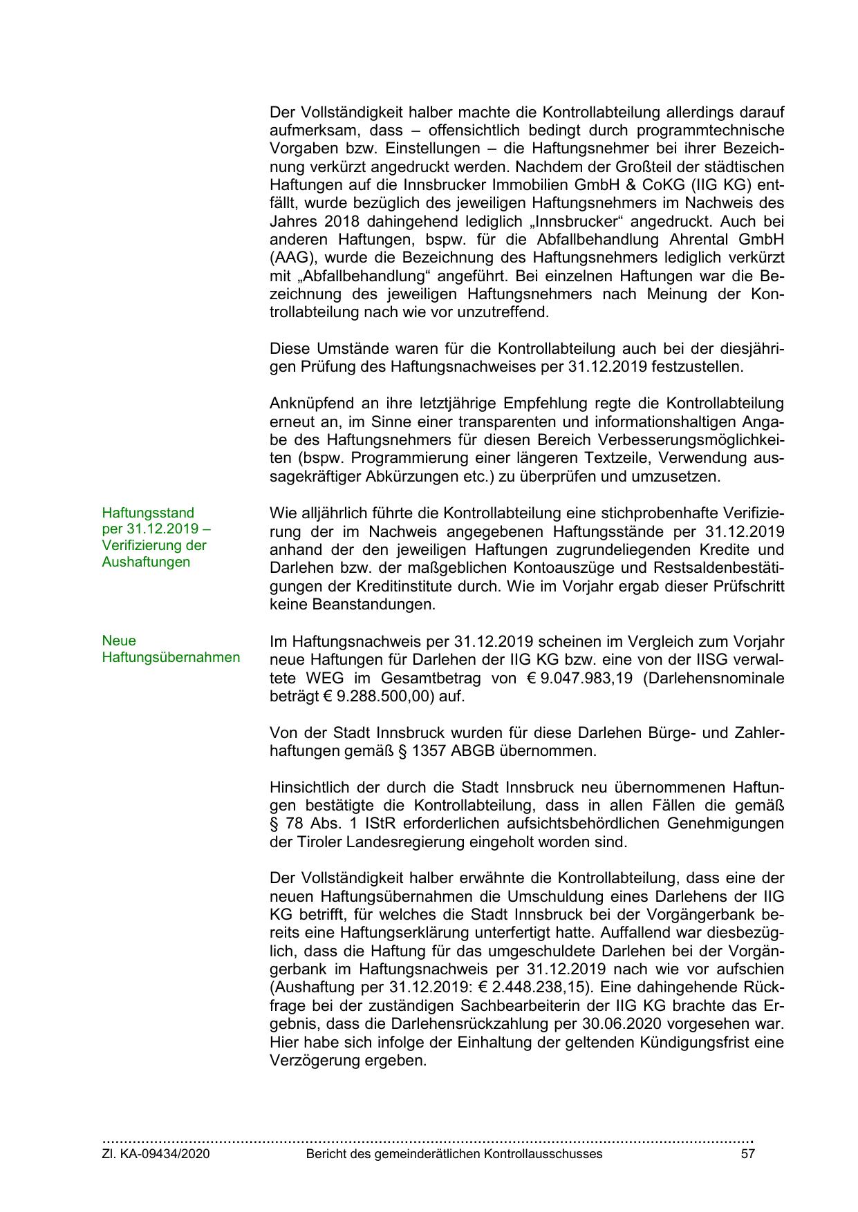 KG betrifft, für welches die Stadt Innsbruck bei der Vorgängerbank bereits eine Haftungserklärung unterfertigt hatte. Auffallend war diesbezüglich, dass die Haftung für das umgeschuldete Darlehen bei der Vorgängerbank im Haftungsnachweis per 31.12.2019 nach wie vor aufschien