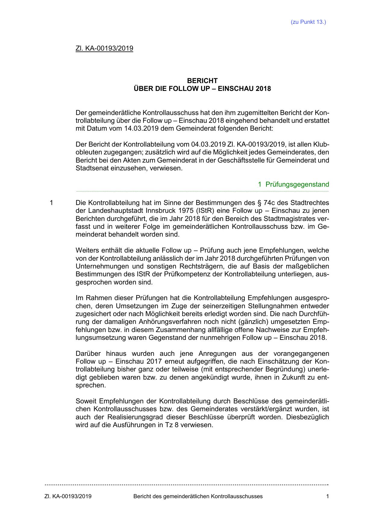 Der gemeinderätliche Kontrollausschuss hat den ihm zugemittelten Bericht der Kontrollabteilung über die Follow up – Einschau 2018 eingehend behandelt und erstattet
