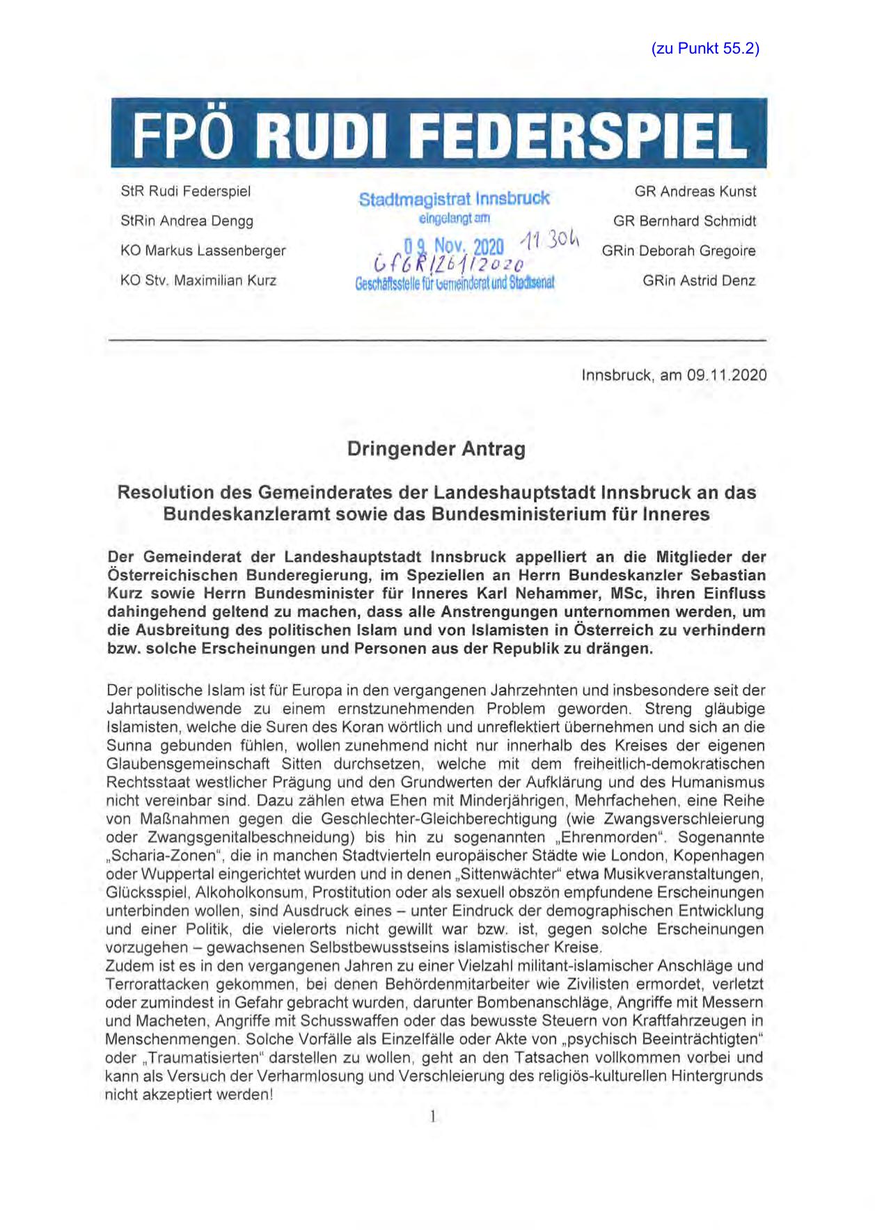 Der Gemeinderat der Landeshauptstadt Innsbruck appelliert an die Mitglieder der