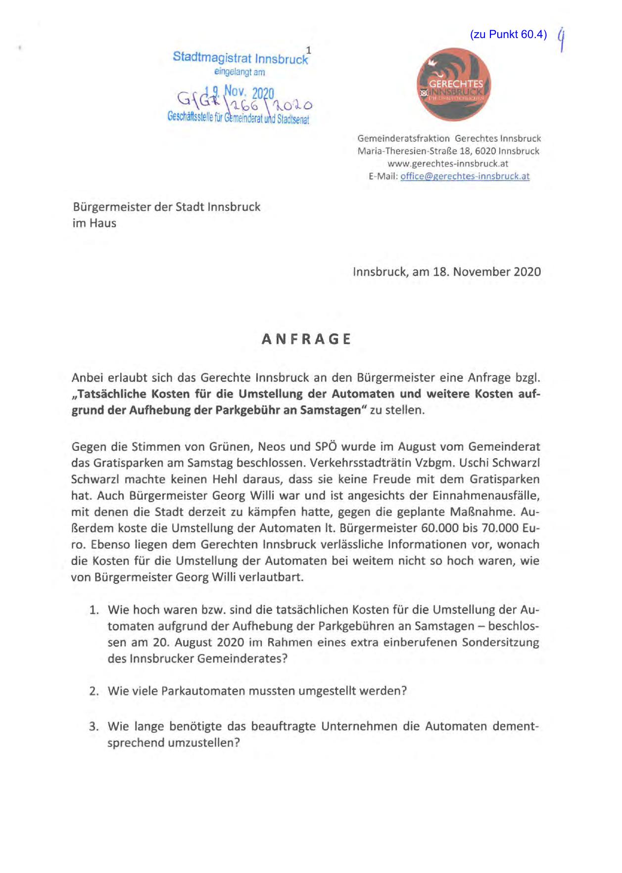 Anbei erlaubt sich das Gerechte Innsbruck an den Bürgermeister eine Anfrage bzgl.