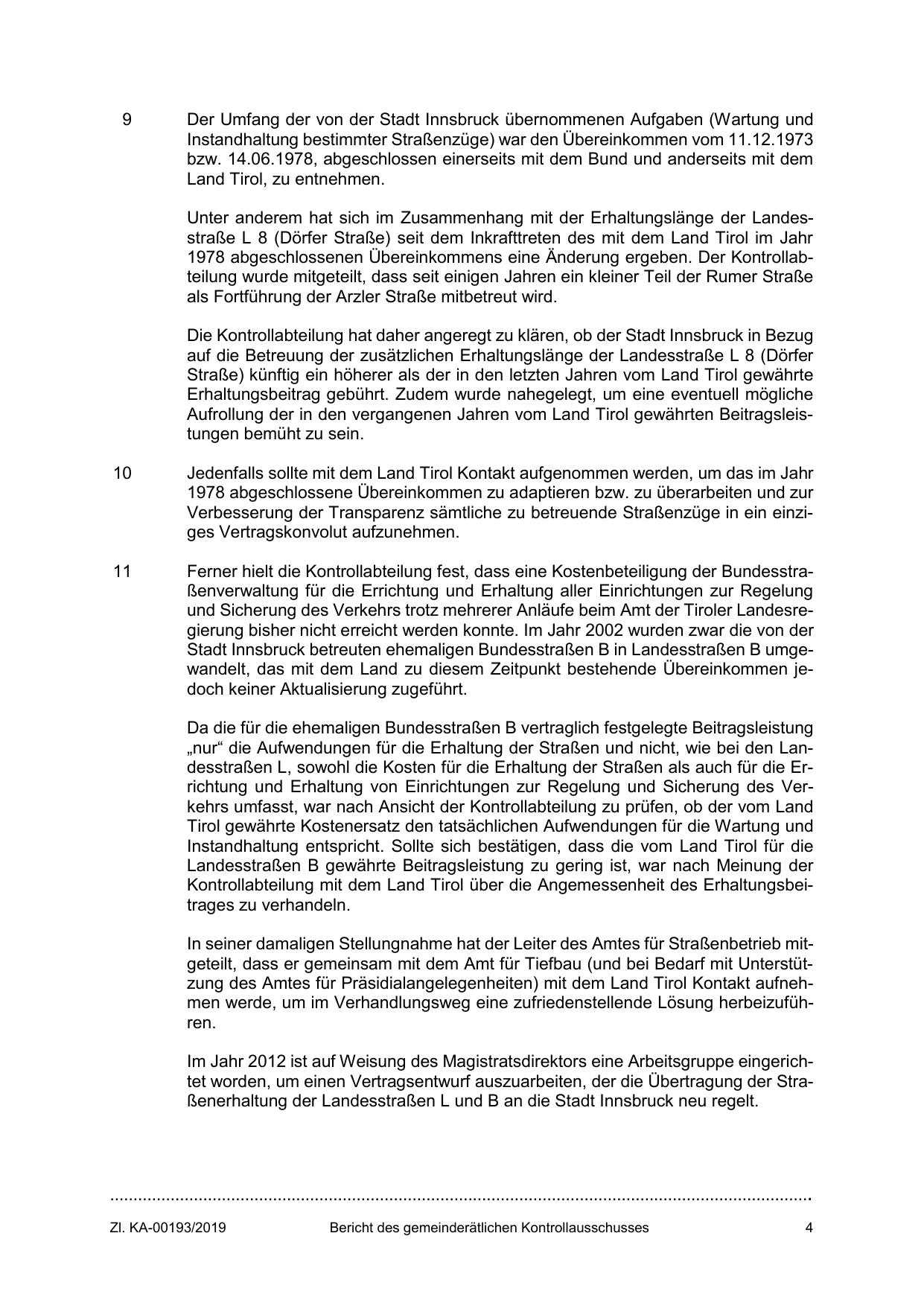 In seiner damaligen Stellungnahme hat der Leiter des Amtes für Straßenbetrieb mitgeteilt, dass er gemeinsam mit dem Amt für Tiefbau (und bei Bedarf mit Unterstützung des Amtes für Präsidialangelegenheiten) mit dem Land Tirol Kontakt aufnehmen werde, um im Verhandlungsweg eine zufriedenstellende Lösung herbeizuführen.