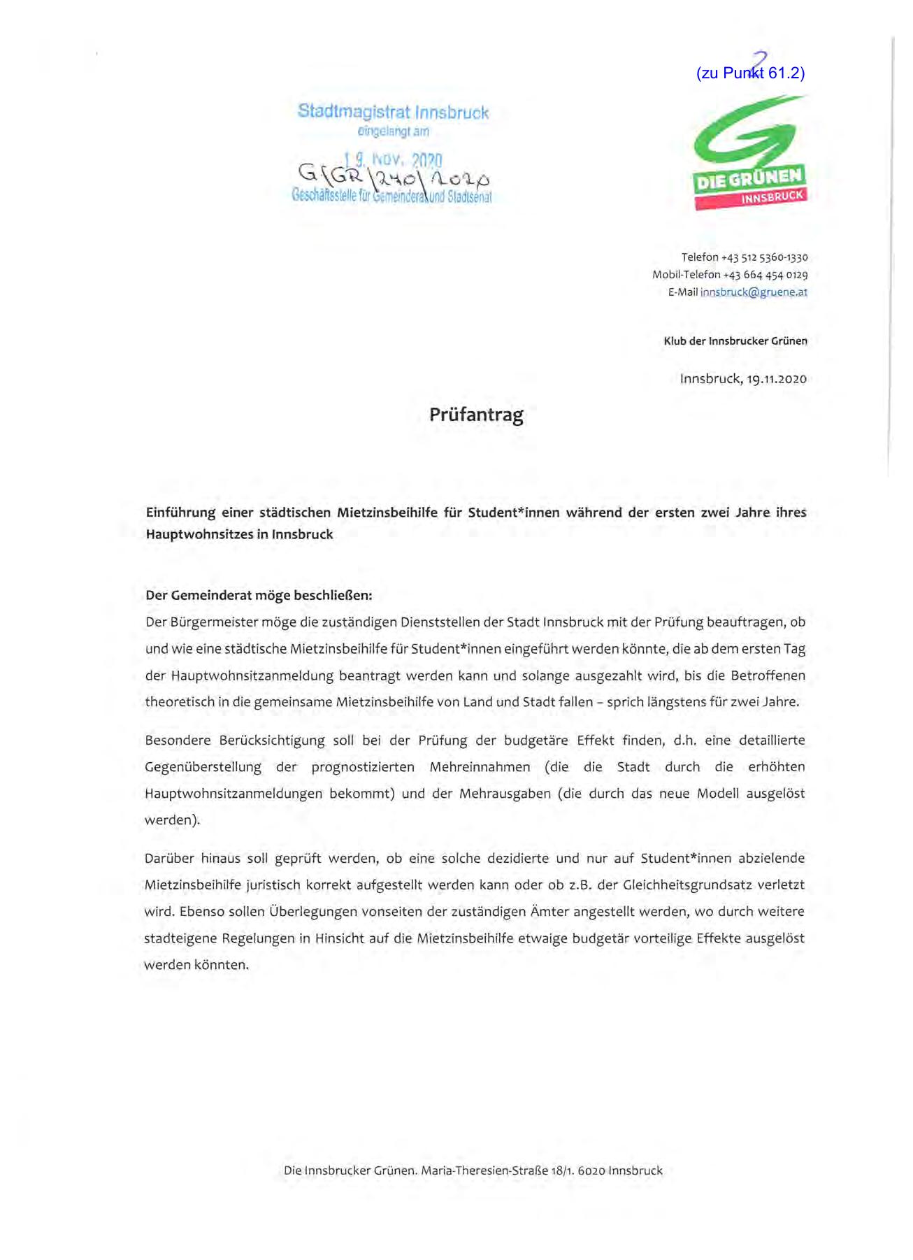 Der Bürgermeister möge die zuständigen Dienststellen der Stadt Innsbruck mit der Prüfung beauftragen, ob