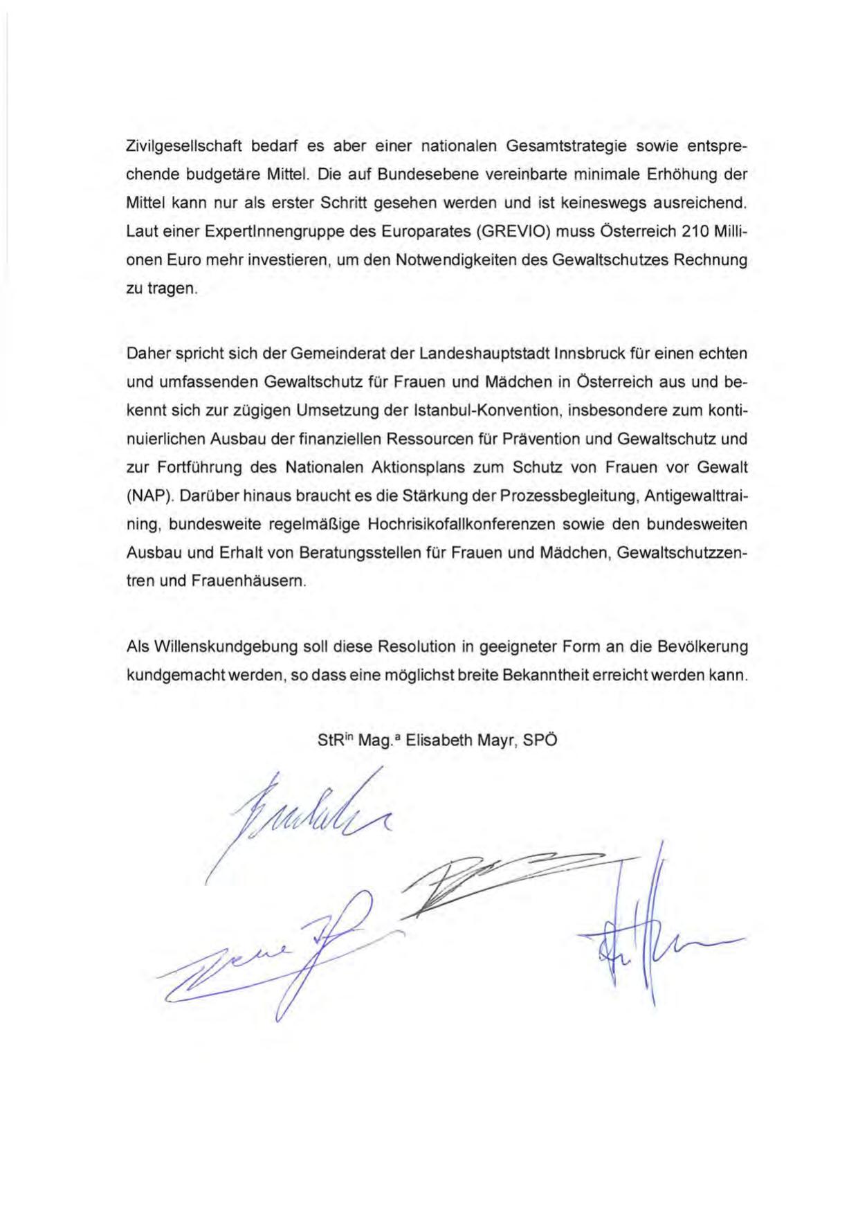 und umfassenden Gewaltschutz für Frauen und Mädchen in Österreich aus und bekennt sich zur zügigen Umsetzung der Istanbul-Konvention , insbesondere zum kontinuierlichen Ausbau der finanziellen Ressourcen für Prävention und Gewaltschutz und