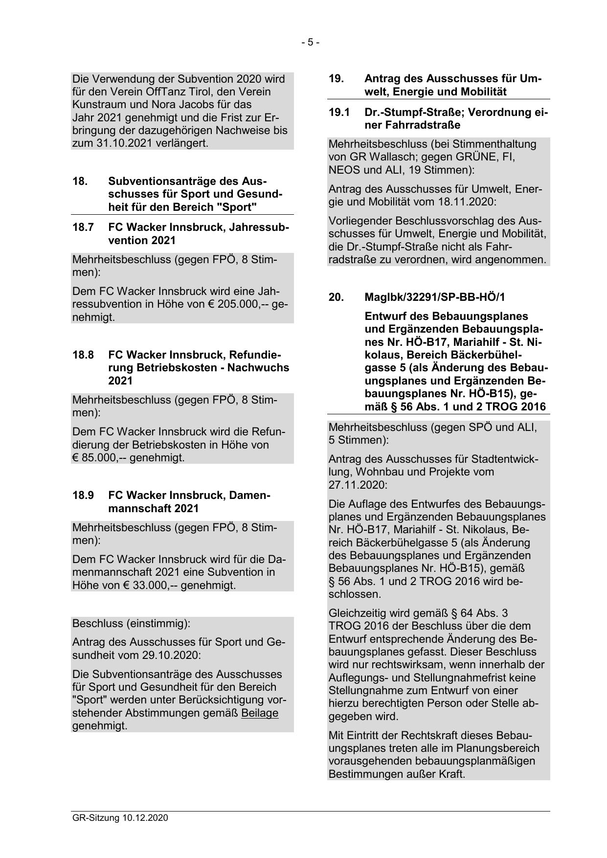 Mehrheitsbeschluss (gegen FPÖ, 8 Stimmen):