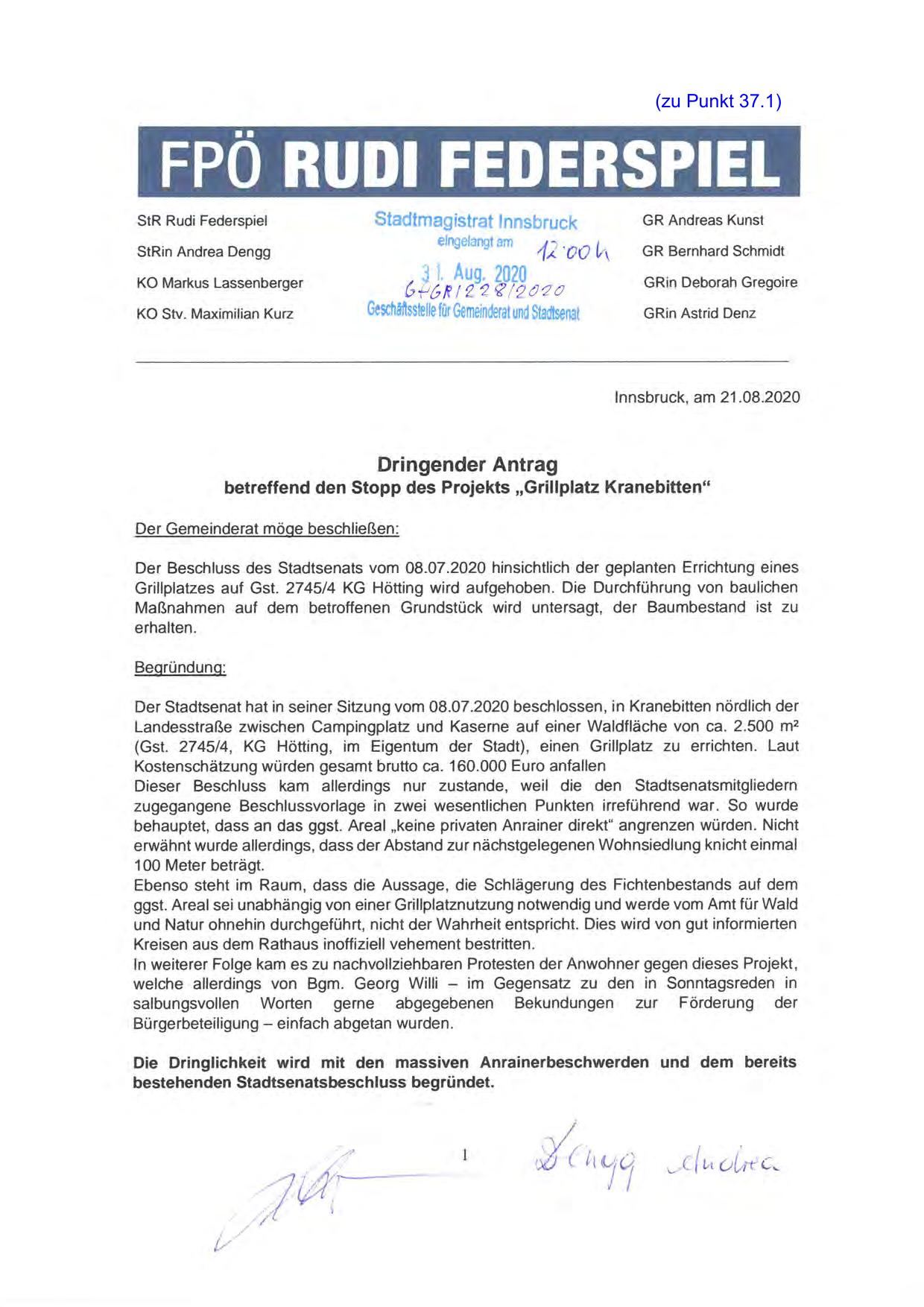 betreffend den Stopp des Projekts „Grillplatz Kranebitten“