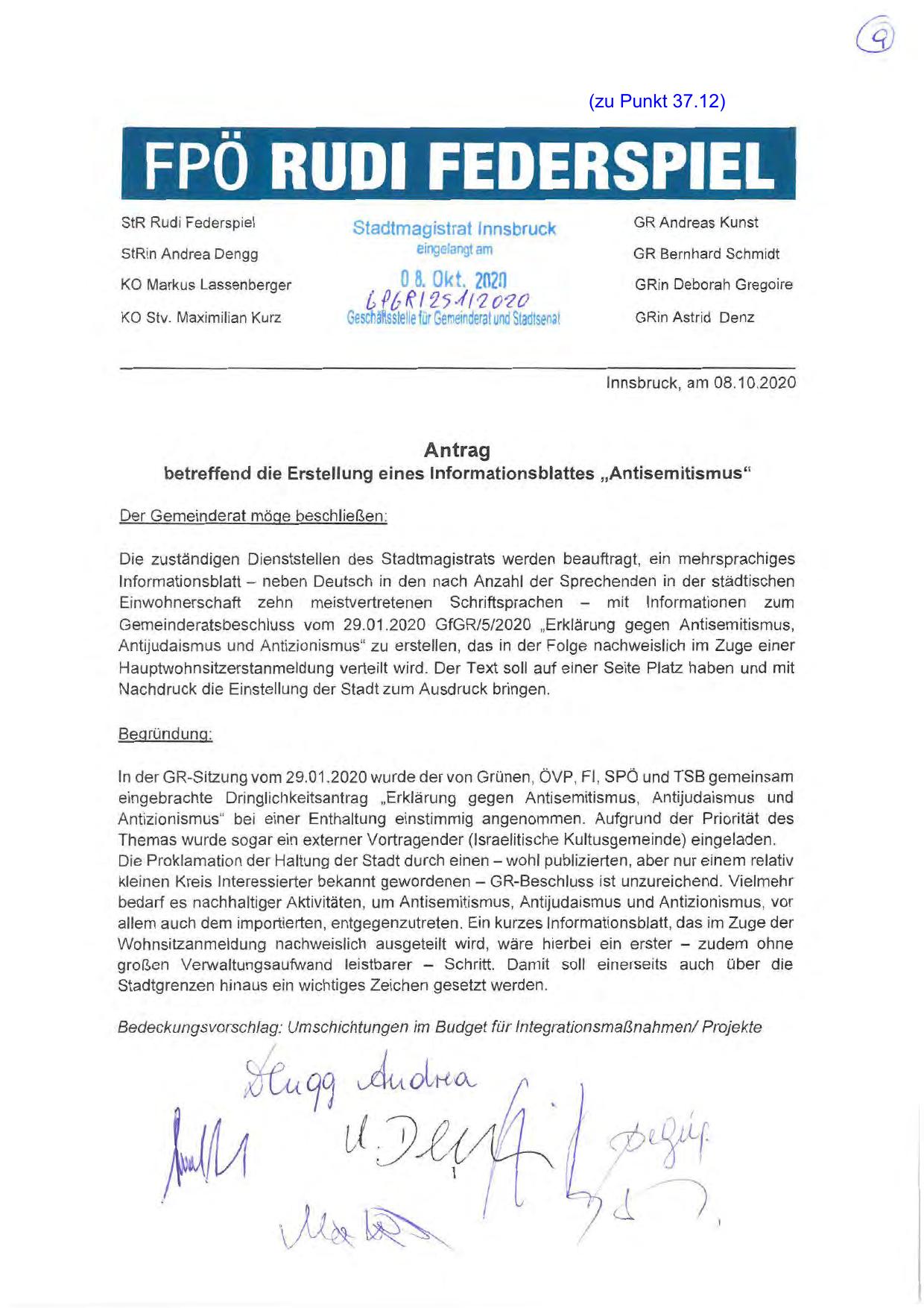 In der GR-Sitzung vom 29.01.2020 wurde der von Grünen, ÖVP, FI , SPÖ und TSB gemeinsam