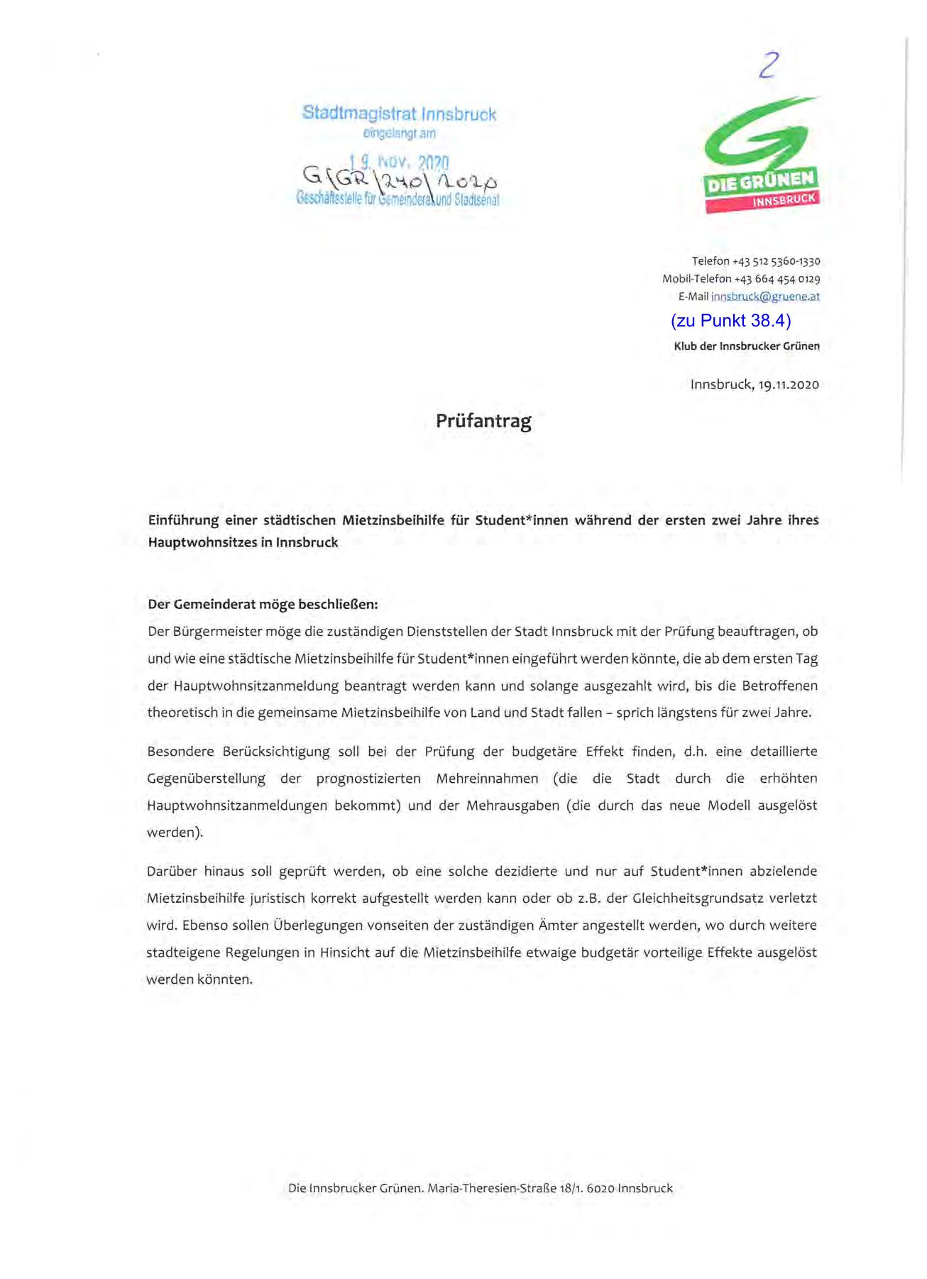 Der Bürgermeister möge die zuständigen Dienststellen der Stadt Innsbruck mit der Prüfung beauftragen, ob