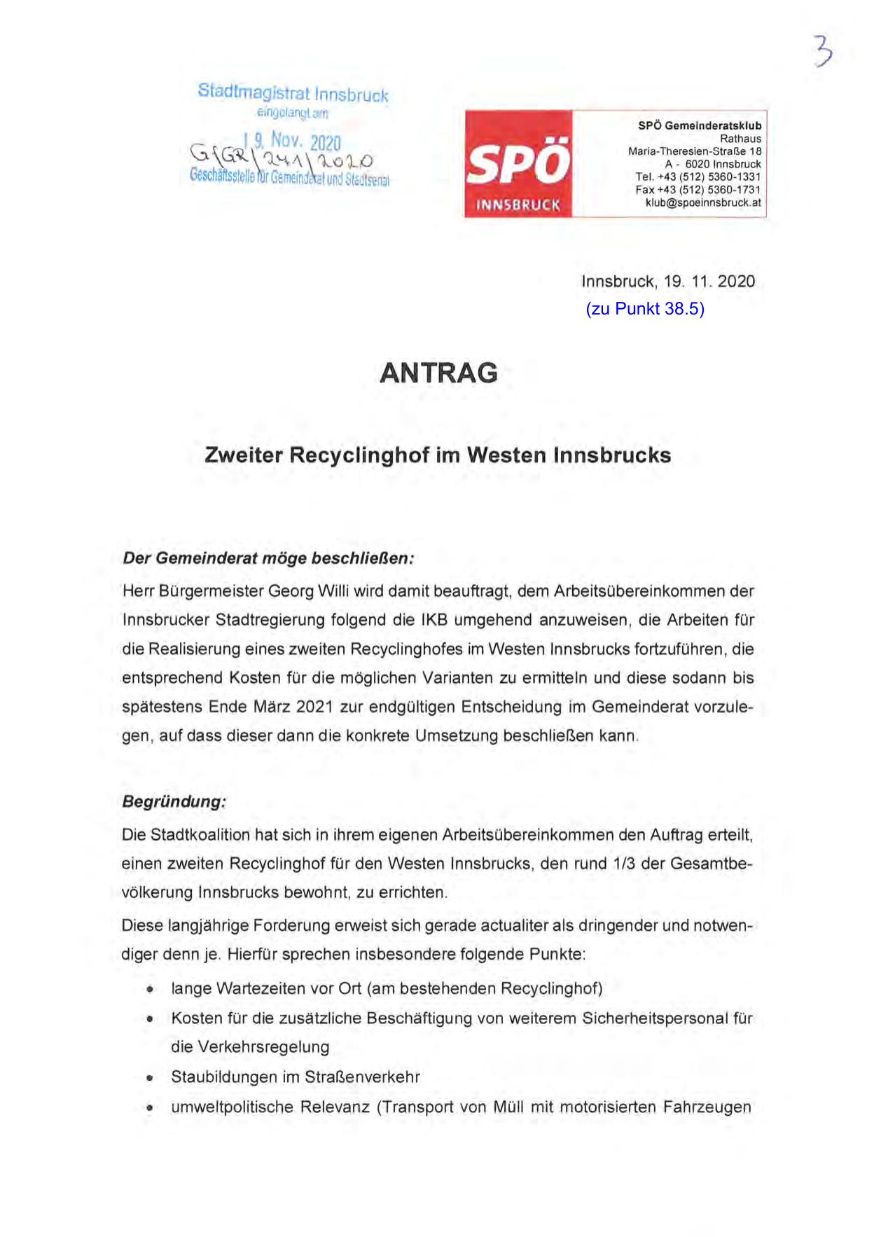 einen zweiten Recyclinghof für den Westen lnnsbrucks, den rund 1/3 der Gesamtbevölkerung lnnsbrucks bewohnt, zu errichten.