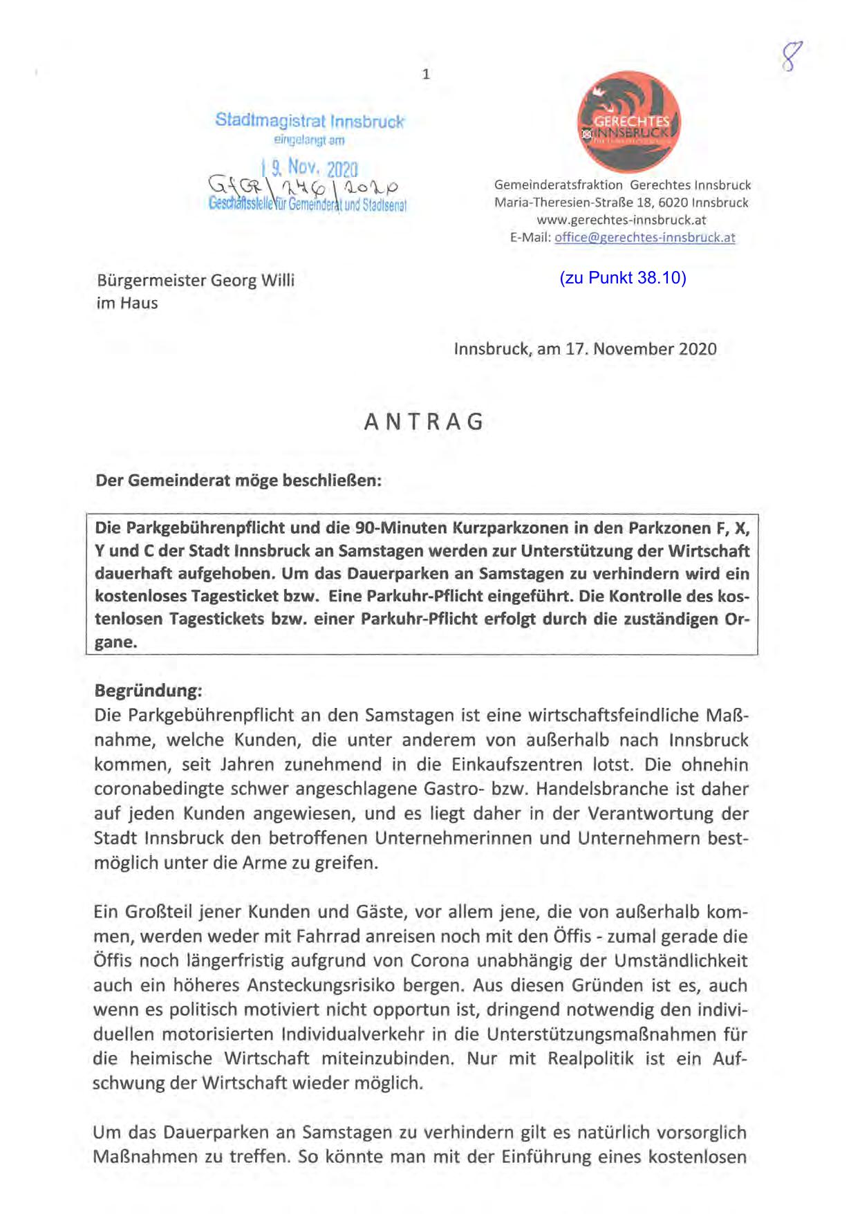 Die Parkgebührenpflicht an den Samstagen ist eine wirtschaftsfeindliche Maßnahme, welche Kunden, die unter anderem von außerhalb nach Innsbruck