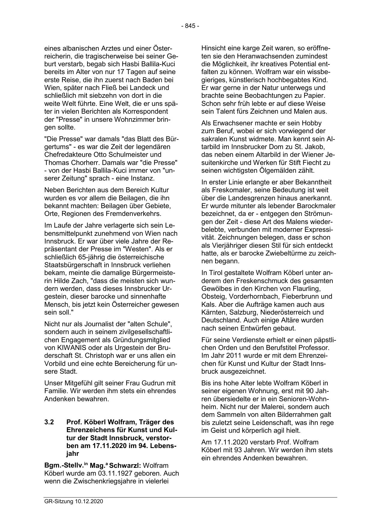 Ehrenzeichens für Kunst und Kultur der Stadt Innsbruck, verstorben am 17.11.2020 im 94. Lebensjahr