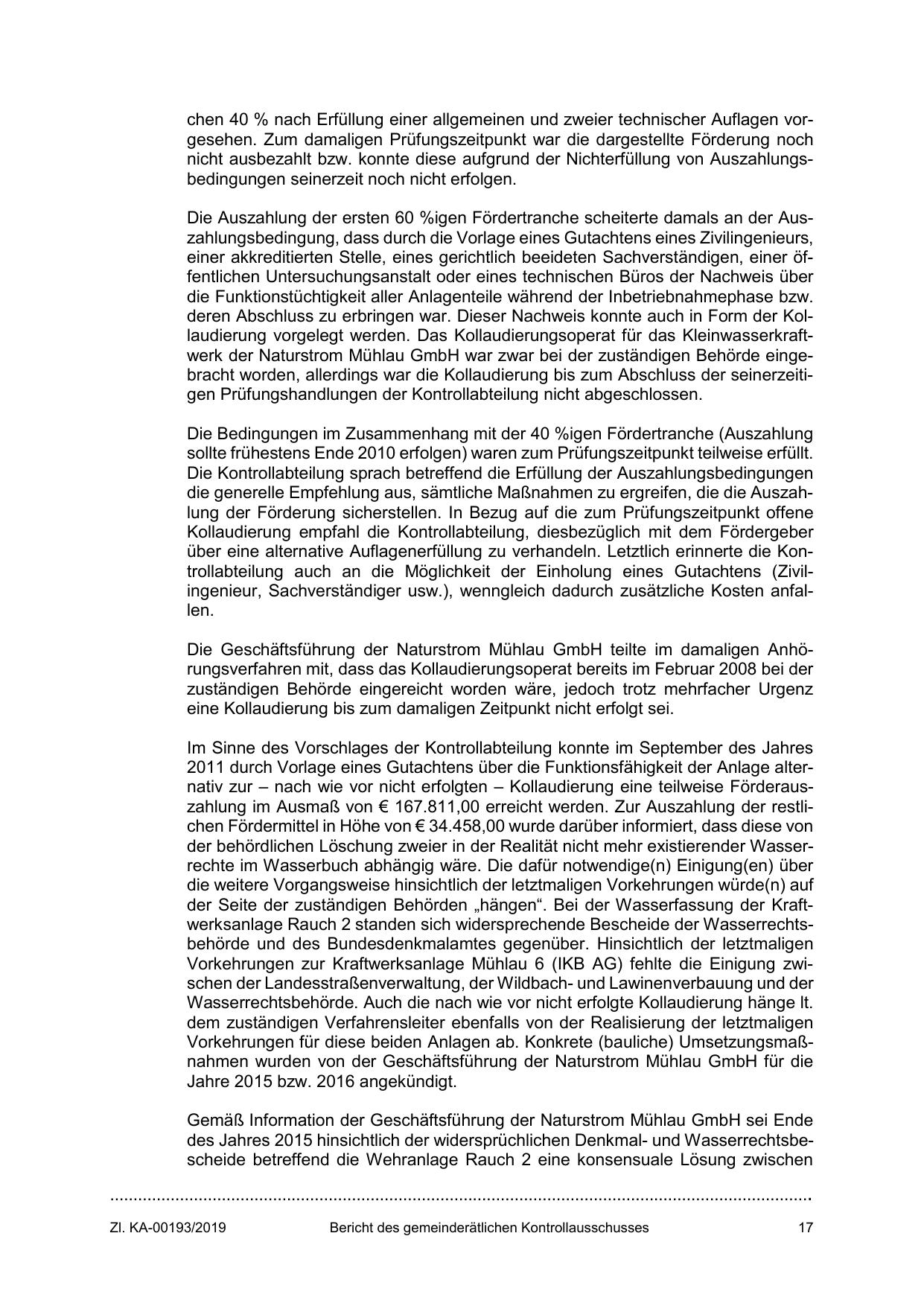 Die Auszahlung der ersten 60 %igen Fördertranche scheiterte damals an der Auszahlungsbedingung, dass durch die Vorlage eines Gutachtens eines Zivilingenieurs,