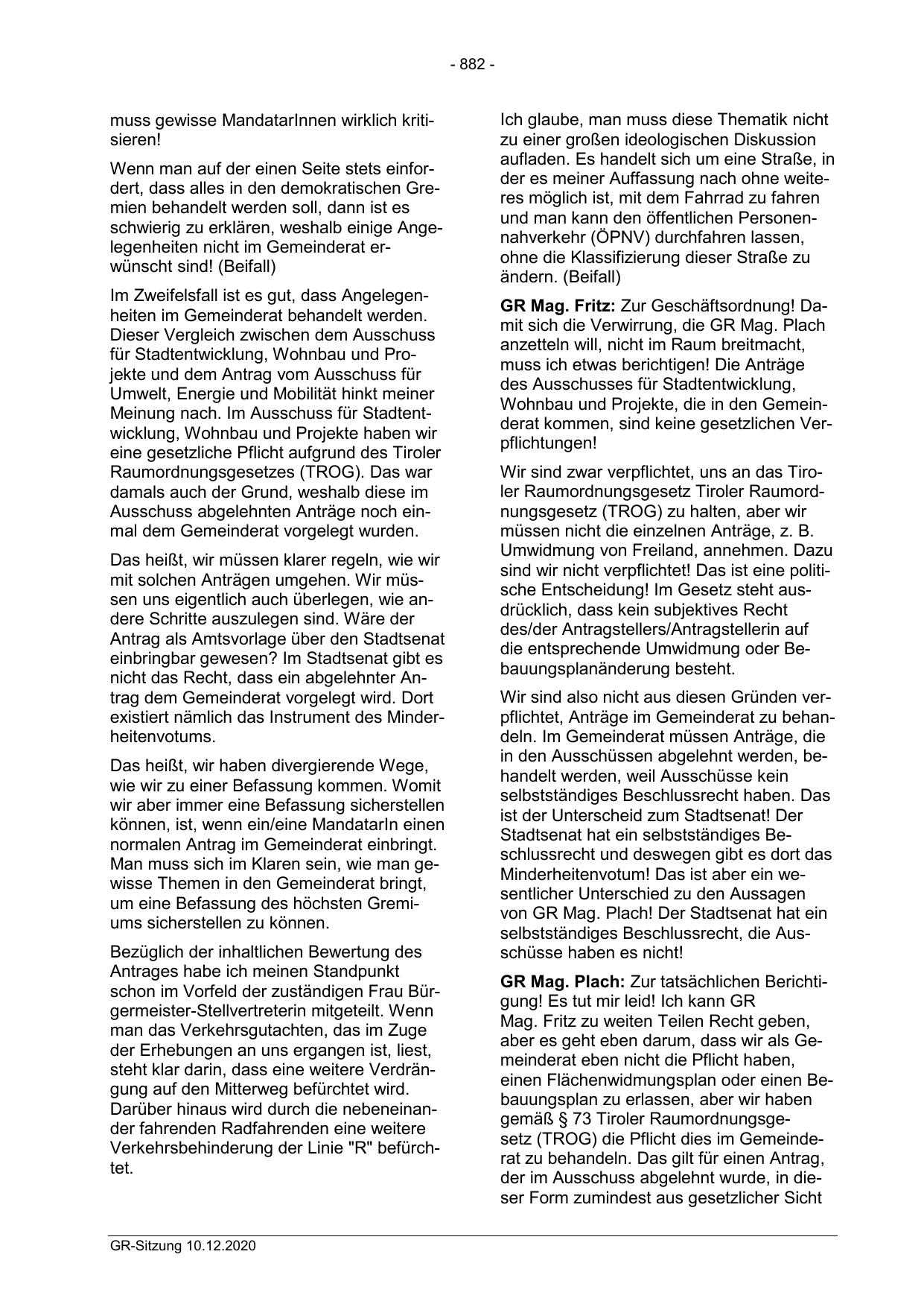 gemäß § 73 Tiroler Raumordnungsgesetz (TROG) die Pflicht dies im Gemeinderat zu behandeln. Das gilt für einen Antrag,