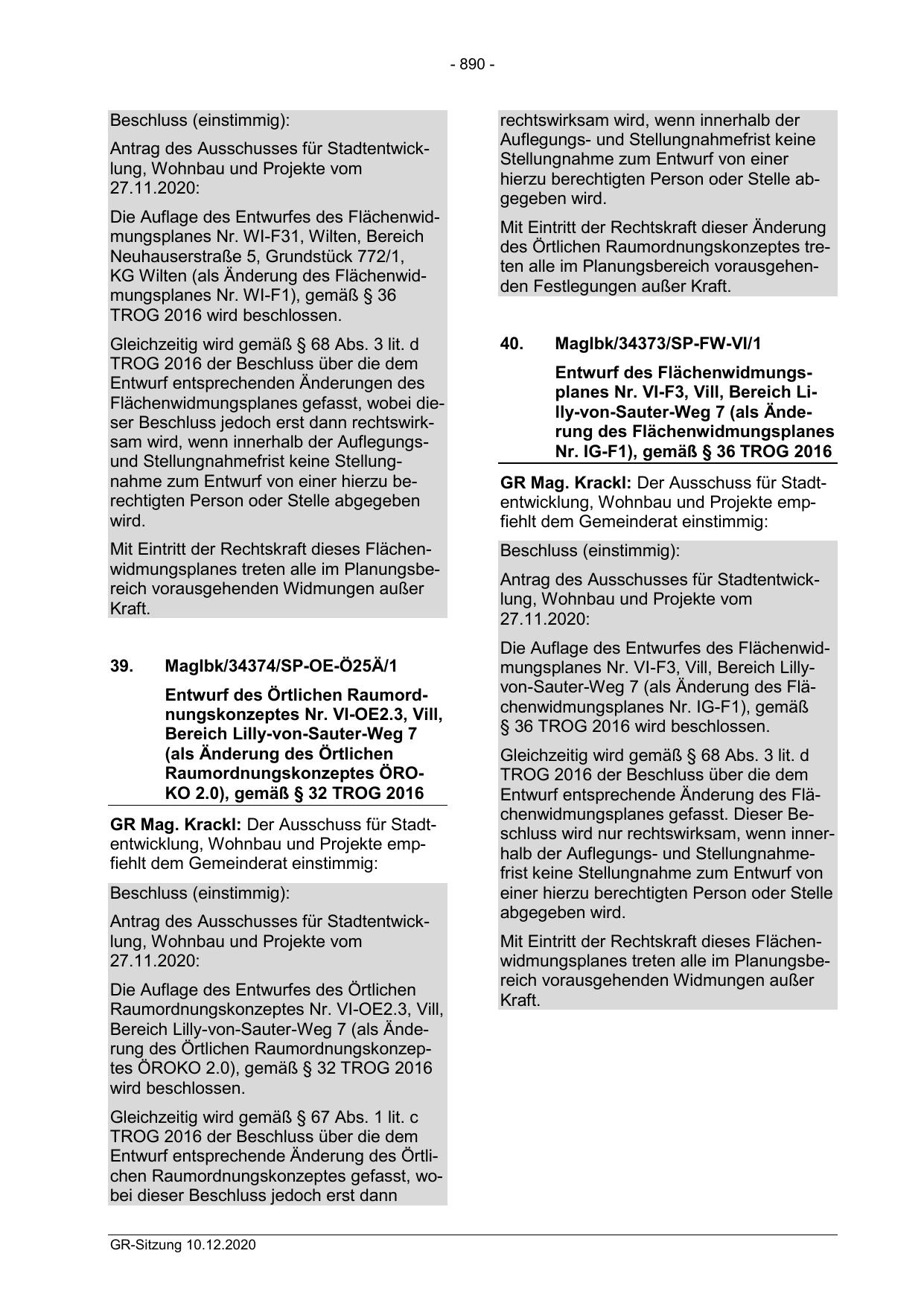 GR Mag. Krackl: Der Ausschuss für Stadtentwicklung, Wohnbau und Projekte empfiehlt dem Gemeinderat einstimmig: