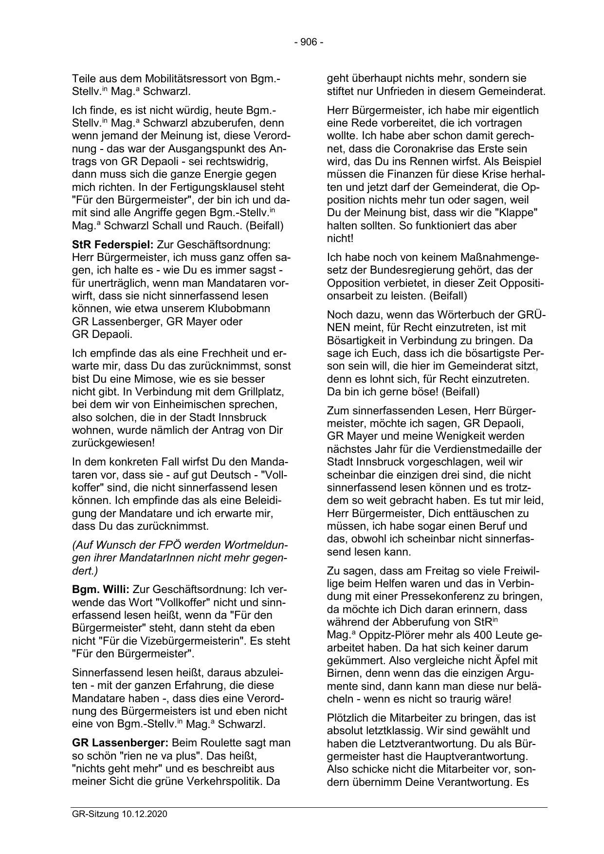 Bgm. Willi: Zur Geschäftsordnung: Ich verwende das Wort "Vollkoffer" nicht und sinnerfassend lesen heißt, wenn da "Für den