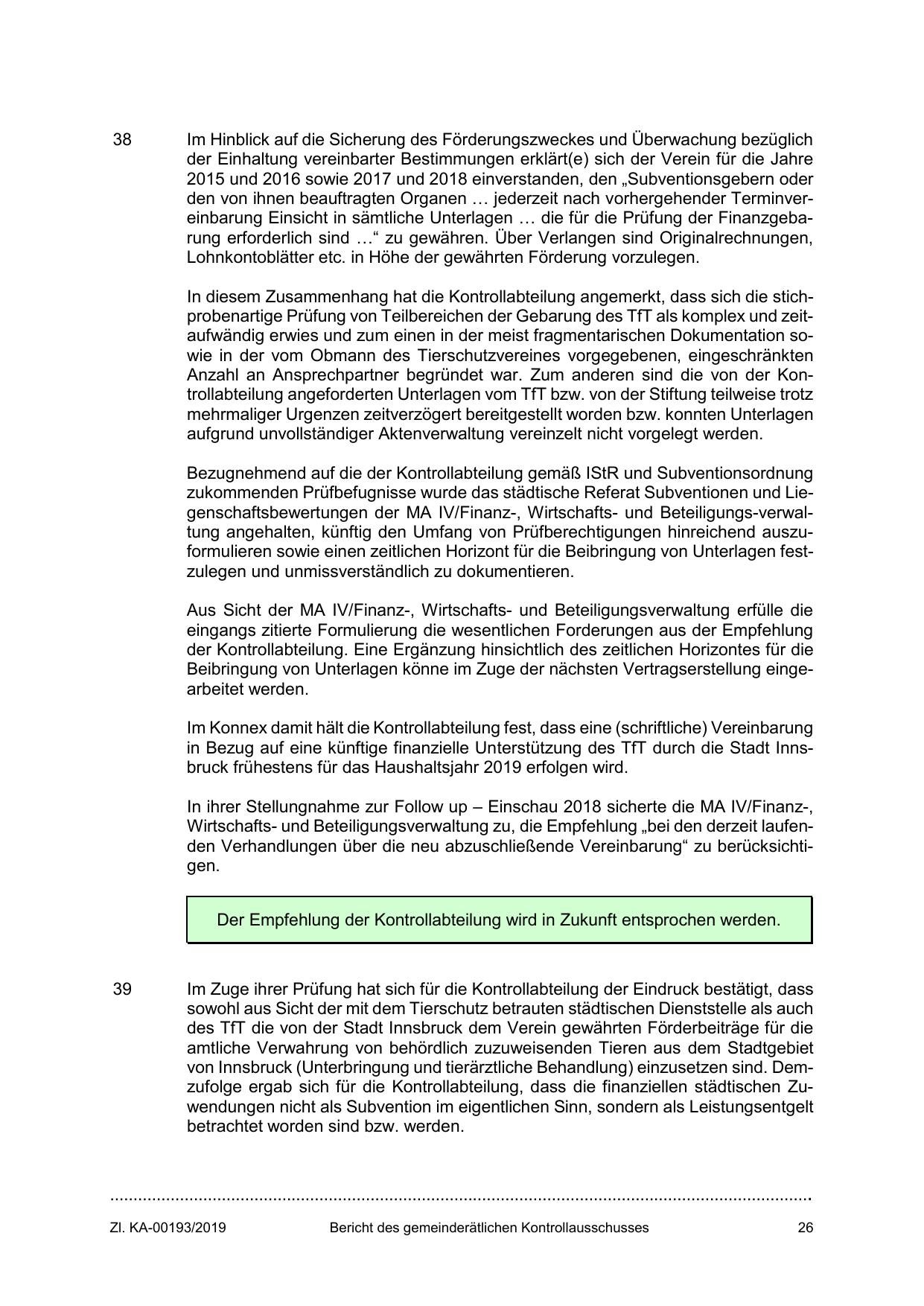 von Innsbruck (Unterbringung und tierärztliche Behandlung) einzusetzen sind. Demzufolge ergab sich für die Kontrollabteilung, dass die finanziellen städtischen Zuwendungen nicht als Subvention im eigentlichen Sinn, sondern als Leistungsentgelt