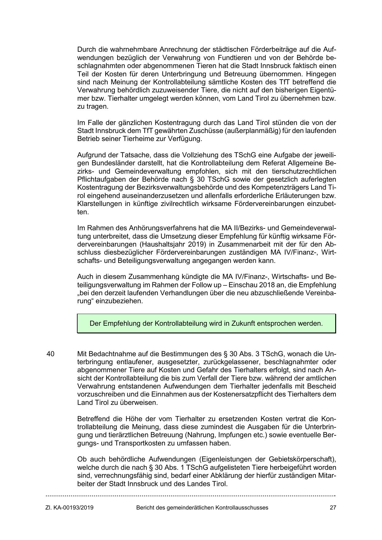 Durch die wahrnehmbare Anrechnung der städtischen Förderbeiträge auf die Aufwendungen bezüglich der Verwahrung von Fundtieren und von der Behörde beschlagnahmten oder abgenommenen Tieren hat die Stadt Innsbruck faktisch einen