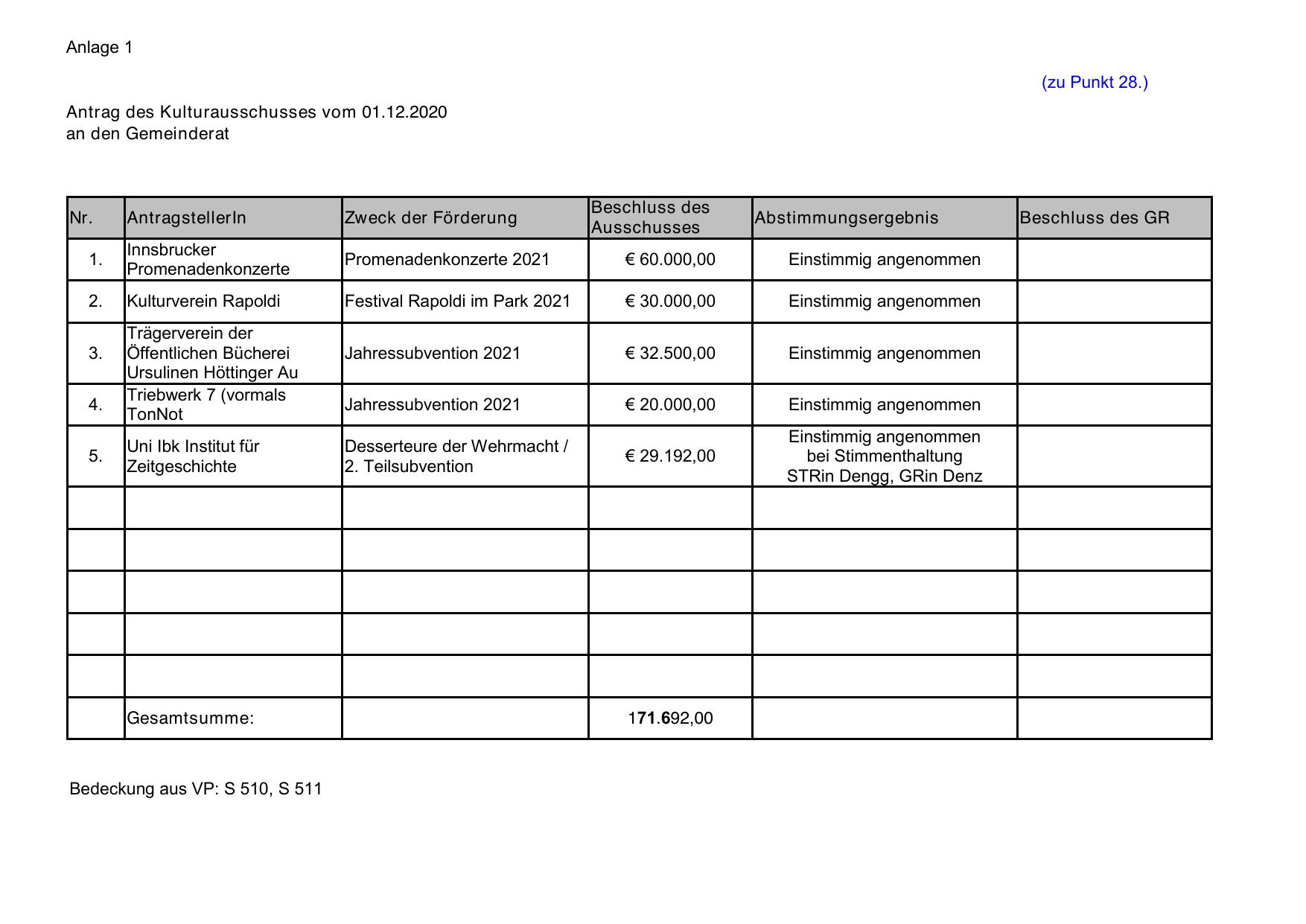 Antrag des Kulturausschusses vom 01.12.2020