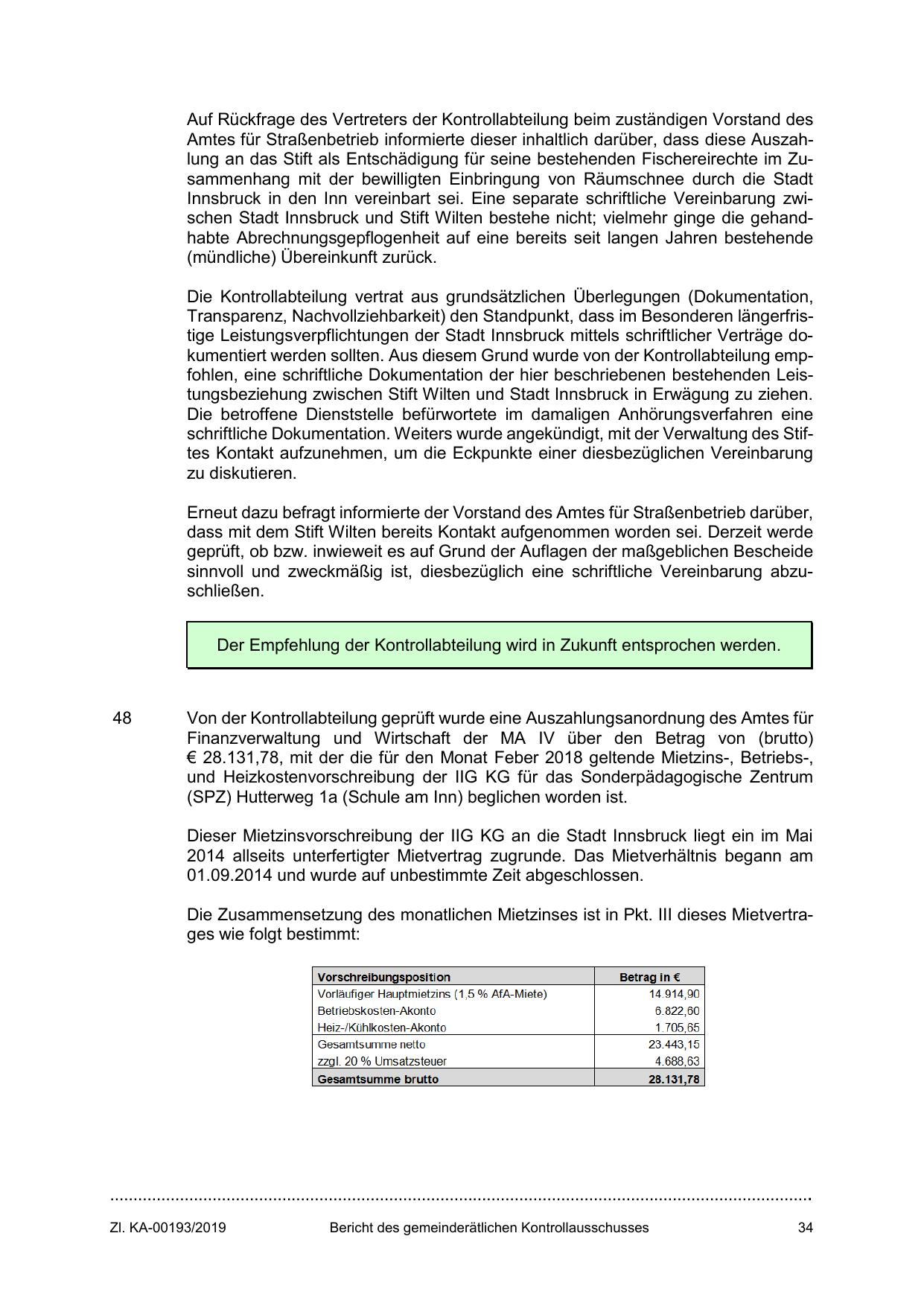Transparenz, Nachvollziehbarkeit) den Standpunkt, dass im Besonderen längerfristige Leistungsverpflichtungen der Stadt Innsbruck mittels schriftlicher Verträge dokumentiert werden sollten. Aus diesem Grund wurde von der Kontrollabteilung empfohlen, eine schriftliche Dokumentation der hier beschriebenen bestehenden Leistungsbeziehung zwischen Stift Wilten und Stadt Innsbruck in Erwägung zu ziehen.