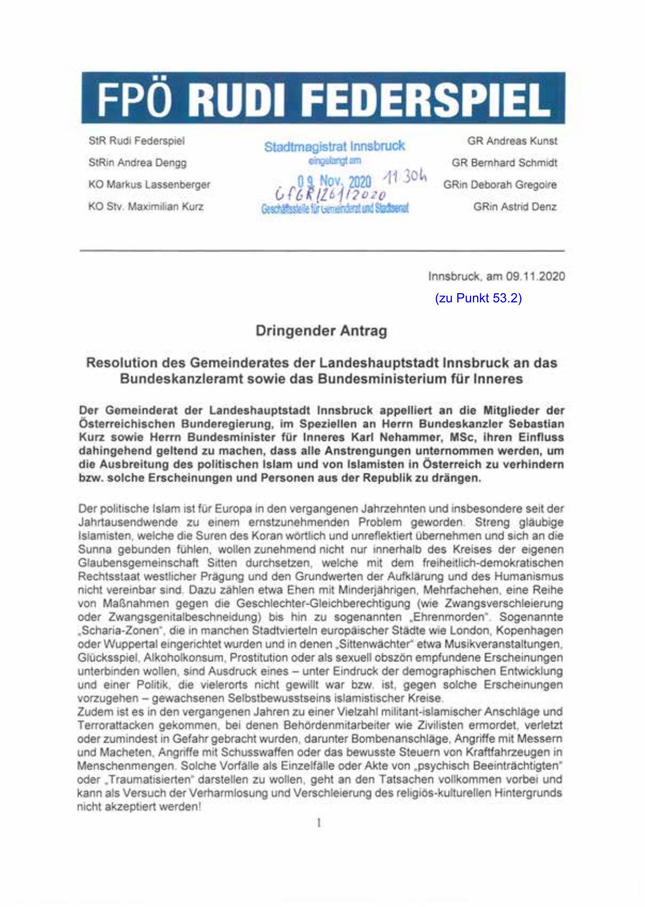 Resolution des Gemeinderates der Landeshauptstadt Innsbruck an das