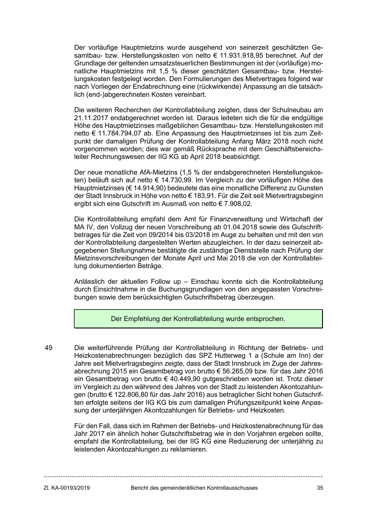 netto € 11.784.794,07 ab. Eine Anpassung des Hauptmietzinses ist bis zum Zeitpunkt der damaligen Prüfung der Kontrollabteilung Anfang März 2018 noch nicht