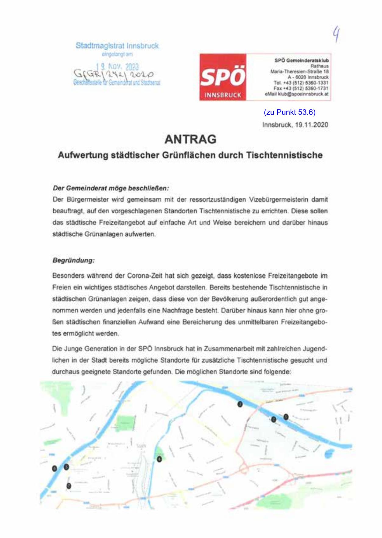 Die Junge Generation in der SPÖ Innsbruck hat in Zusammenarbeit mit zahlreichen Jugendlichen in der Stadt bereits mögliche Standorte für zusätzliche Tischtennistische gesucht und