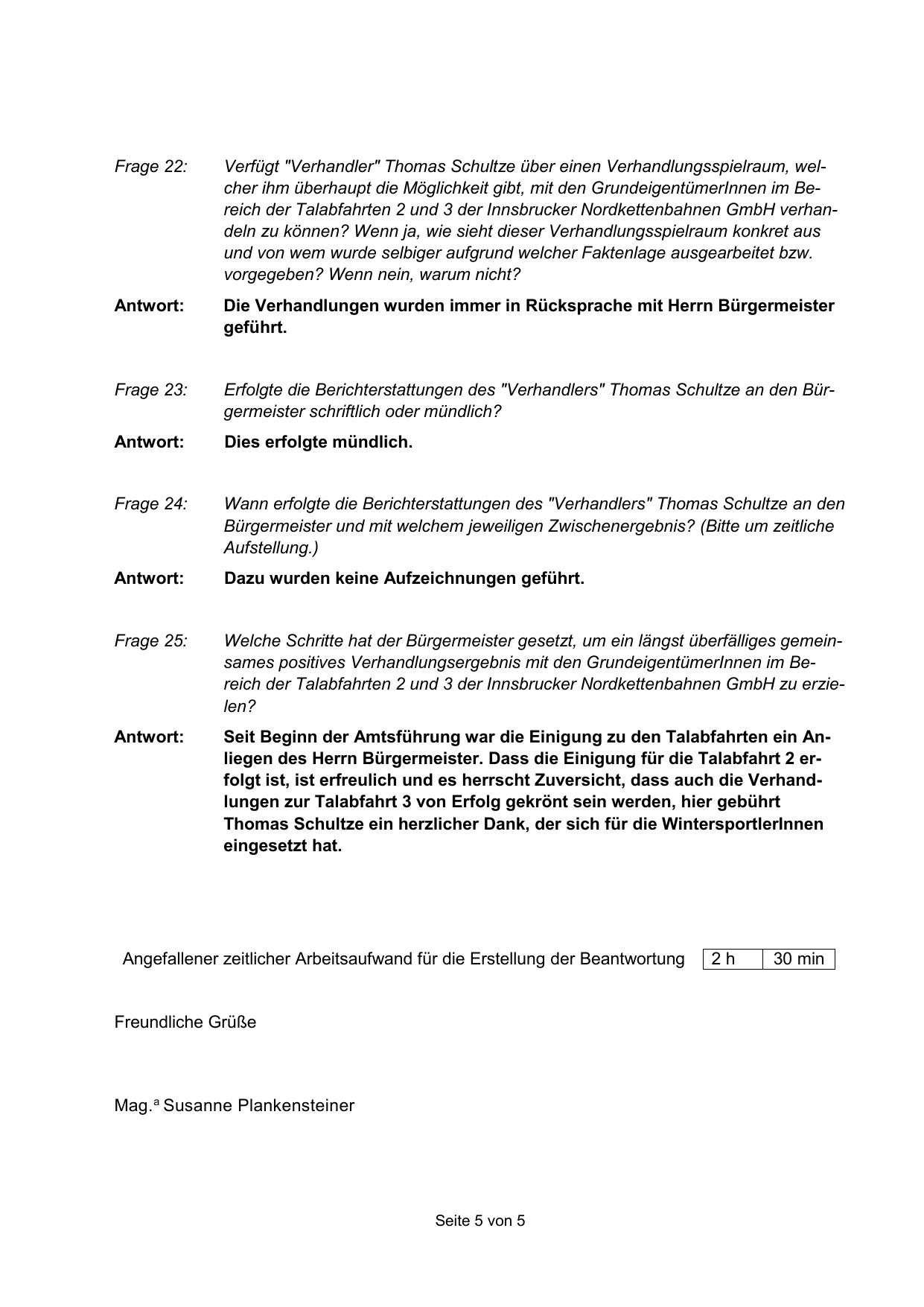 Verfügt "Verhandler" Thomas Schultze über einen Verhandlungsspielraum, welcher ihm überhaupt die Möglichkeit gibt, mit den GrundeigentümerInnen im Bereich der Talabfahrten 2 und 3 der Innsbrucker Nordkettenbahnen GmbH verhandeln zu können? Wenn ja, wie sieht dieser Verhandlungsspielraum konkret aus