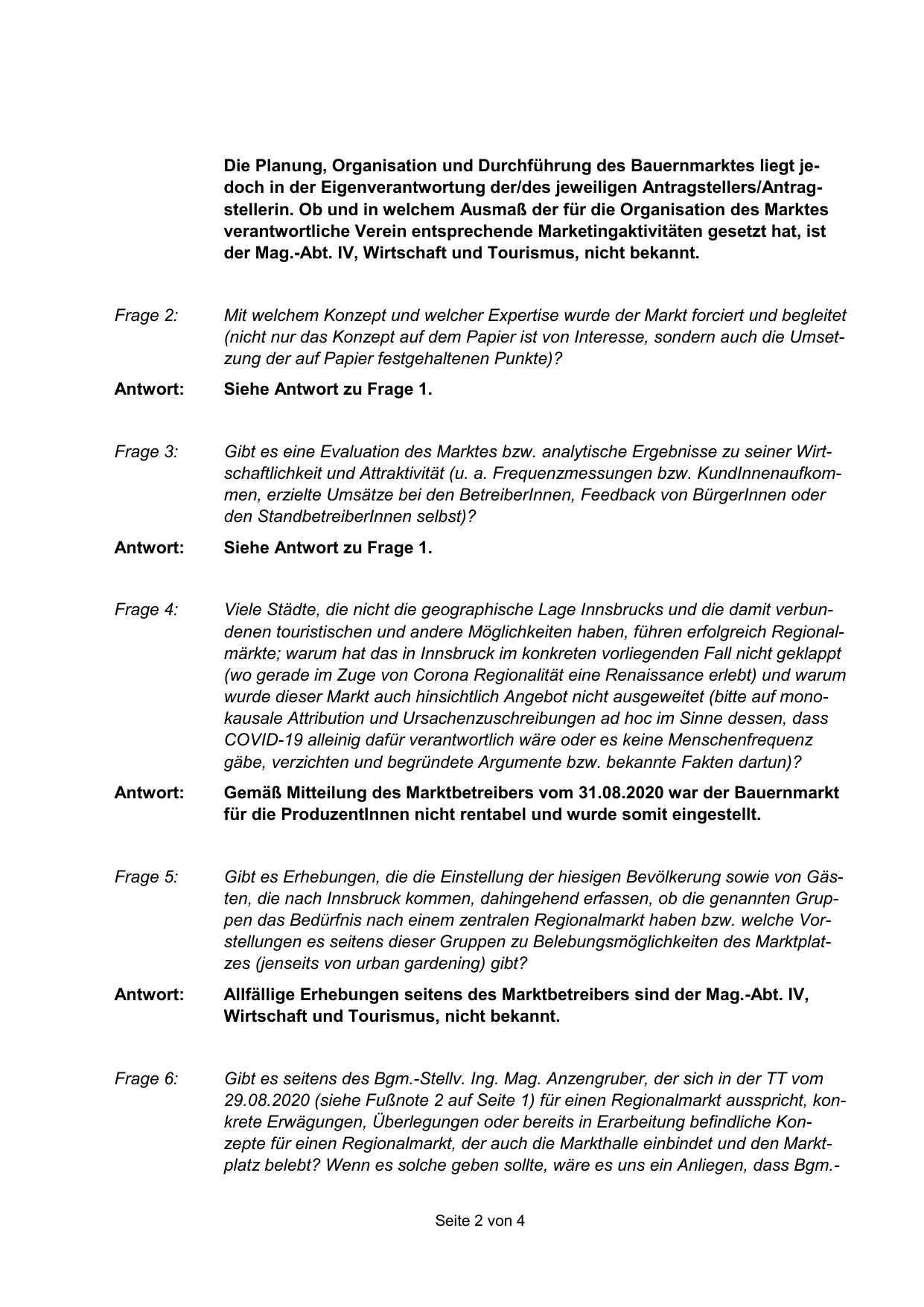 29.08.2020 (siehe Fußnote 2 auf Seite 1) für einen Regionalmarkt ausspricht, konkrete Erwägungen, Überlegungen oder bereits in Erarbeitung befindliche Konzepte für einen Regionalmarkt, der auch die Markthalle einbindet und den Marktplatz belebt? Wenn es solche geben sollte, wäre es uns ein Anliegen, dass Bgm.Seite 2 von 4