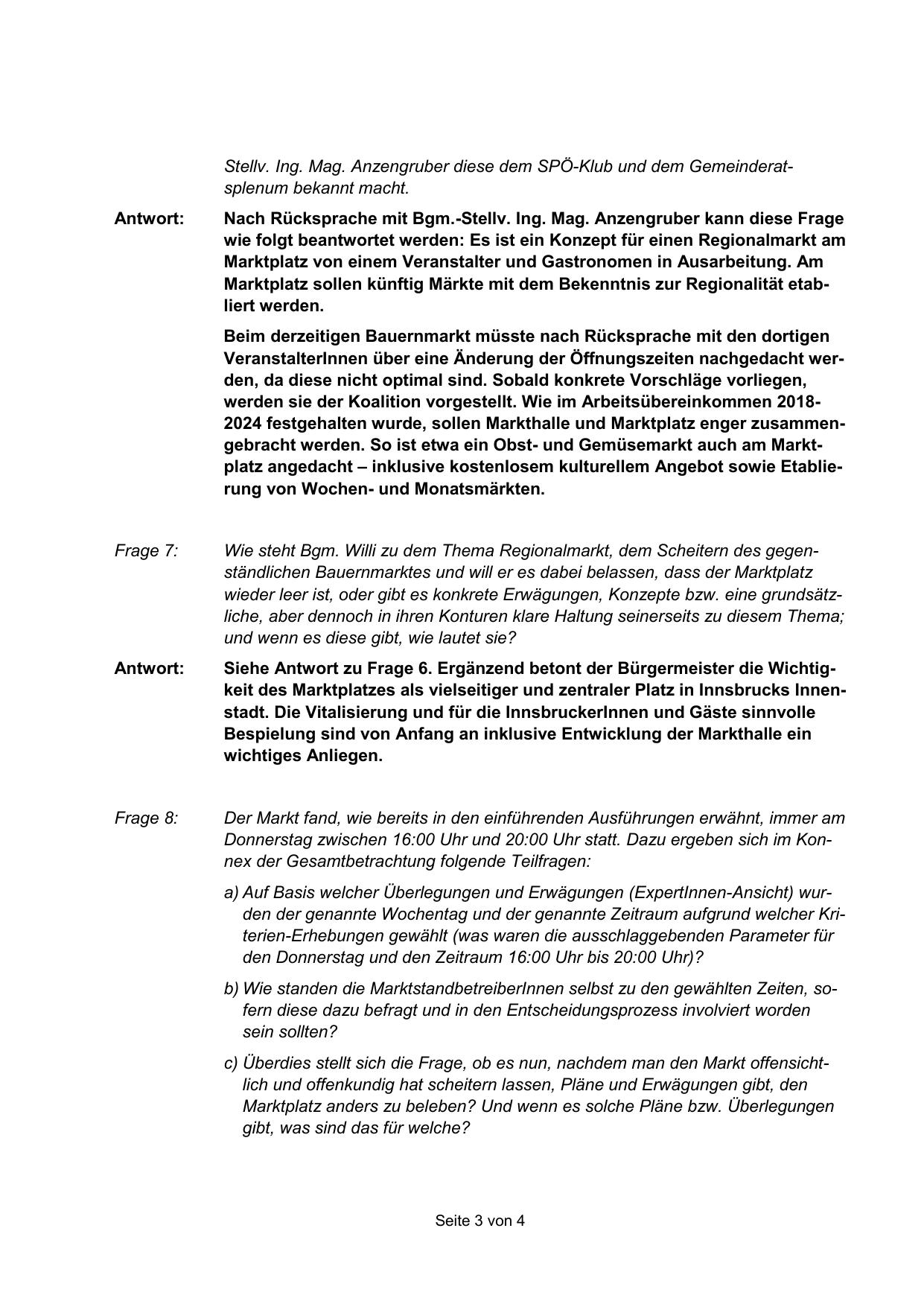 Siehe Antwort zu Frage 6. Ergänzend betont der Bürgermeister die Wichtigkeit des Marktplatzes als vielseitiger und zentraler Platz in Innsbrucks Innenstadt. Die Vitalisierung und für die InnsbruckerInnen und Gäste sinnvolle