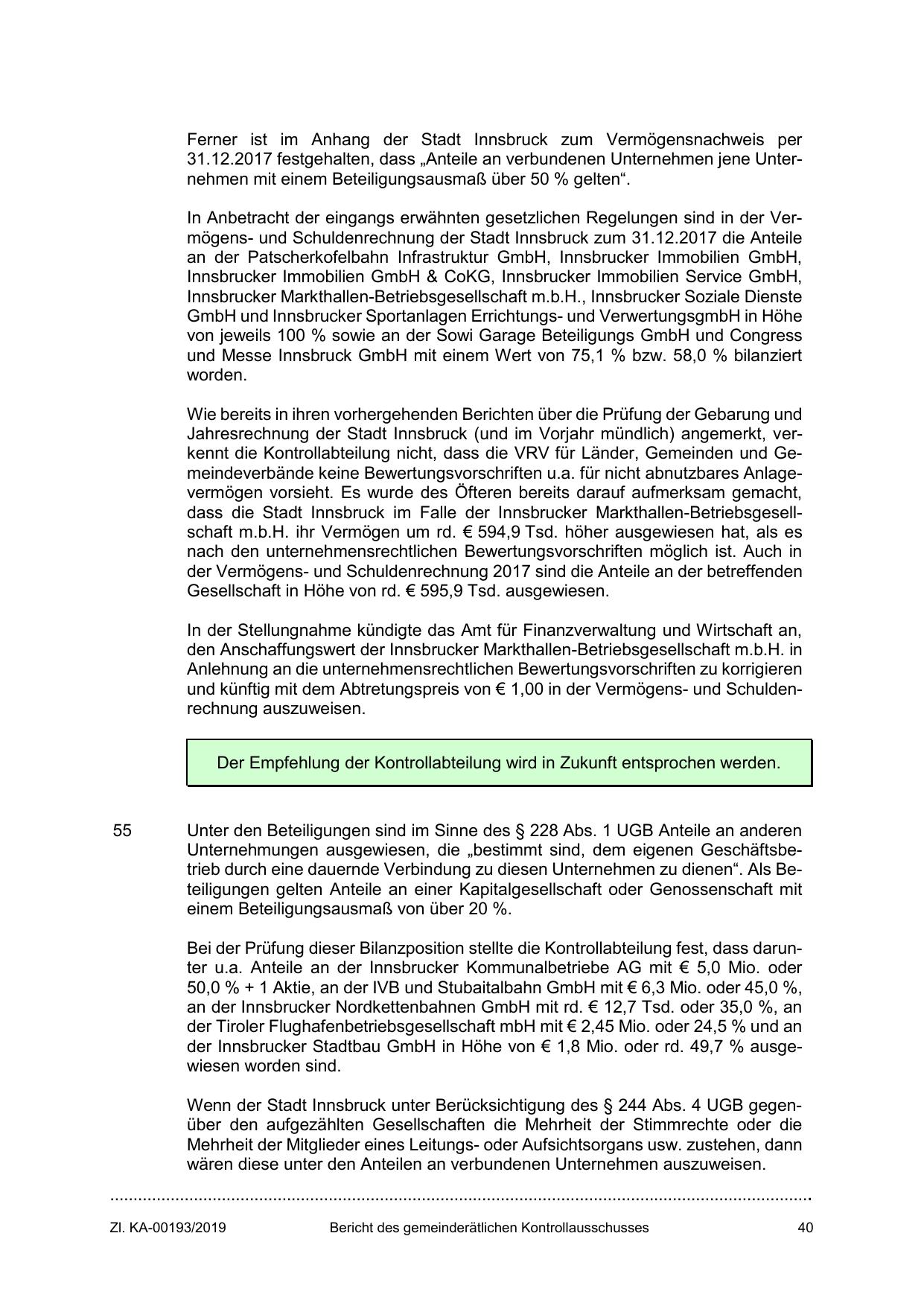 In Anbetracht der eingangs erwähnten gesetzlichen Regelungen sind in der Vermögens- und Schuldenrechnung der Stadt Innsbruck zum 31.12.2017 die Anteile