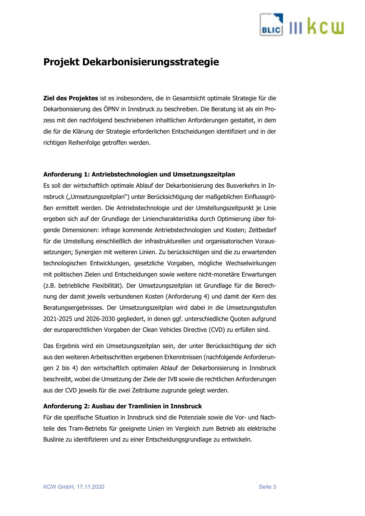 Dekarbonisierung des ÖPNV in Innsbruck zu beschreiben. Die Beratung ist als ein Prozess mit den nachfolgend beschriebenen inhaltlichen Anforderungen gestaltet, in dem