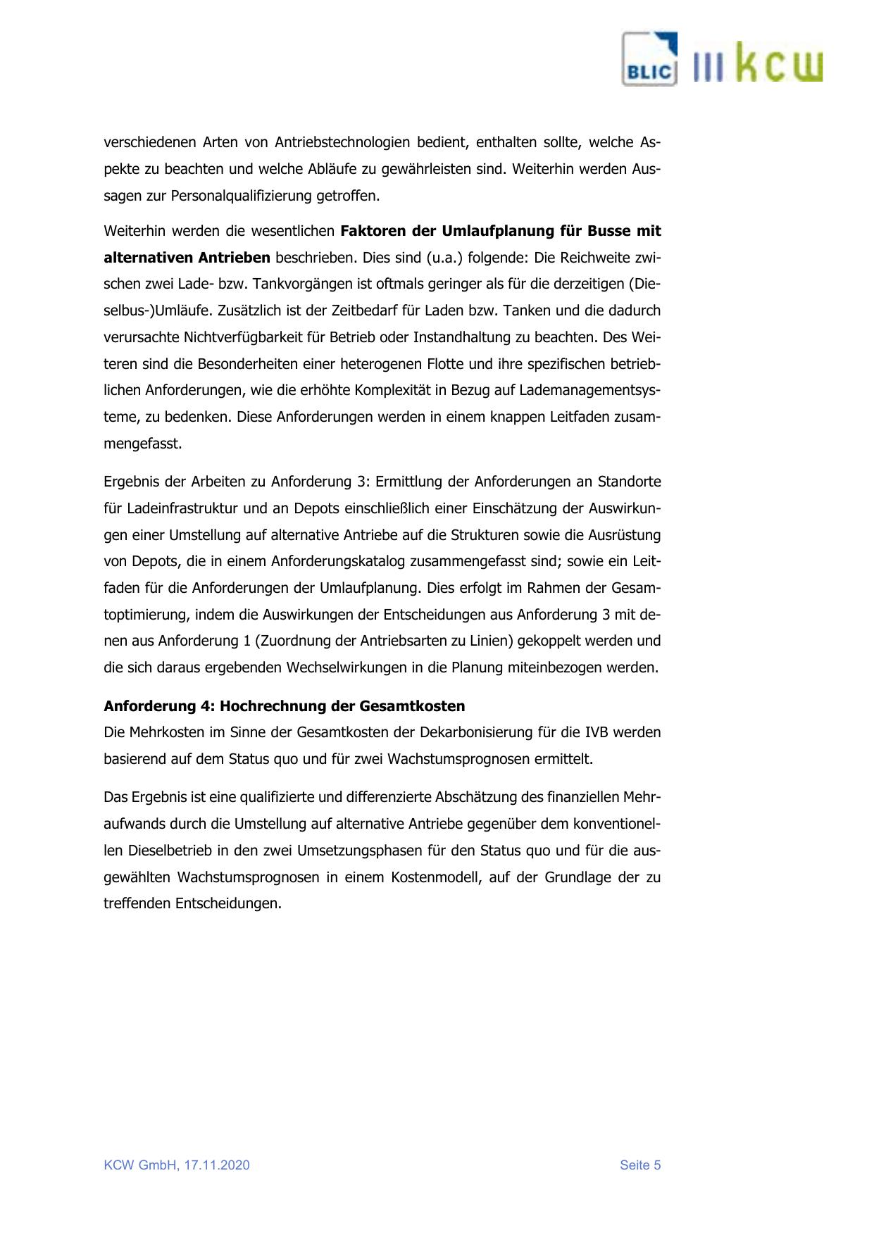 von Depots, die in einem Anforderungskatalog zusammengefasst sind; sowie ein Leitfaden für die Anforderungen der Umlaufplanung. Dies erfolgt im Rahmen der Gesamtoptimierung, indem die Auswirkungen der Entscheidungen aus Anforderung 3 mit denen aus Anforderung 1 (Zuordnung der Antriebsarten zu Linien) gekoppelt werden und