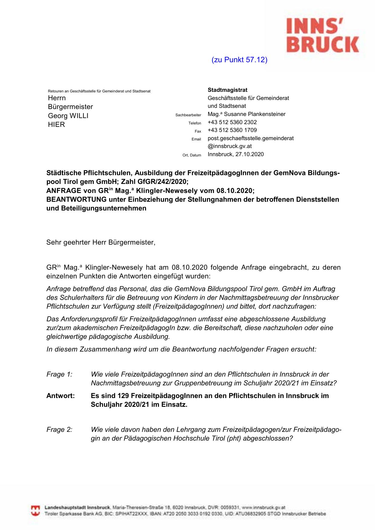 Städtische Pflichtschulen, Ausbildung der FreizeitpädagogInnen der GemNova Bildungspool Tirol gem GmbH; Zahl GfGR/242/2020;