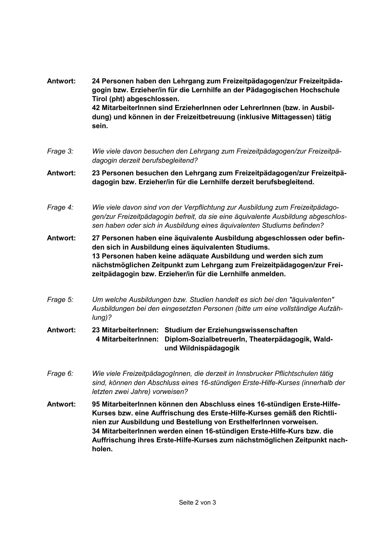 Wie viele FreizeitpädagogInnen, die derzeit in Innsbrucker Pflichtschulen tätig