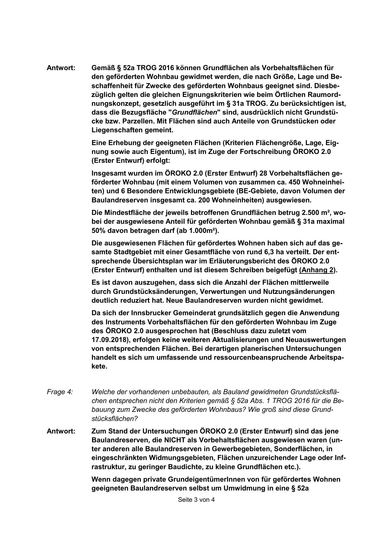 Welche der vorhandenen unbebauten, als Bauland gewidmeten Grundstücksflächen entsprechen nicht den Kriterien gemäß § 52a Abs. 1 TROG 2016 für die Bebauung zum Zwecke des geförderten Wohnbaus? Wie groß sind diese Grundstücksflächen?