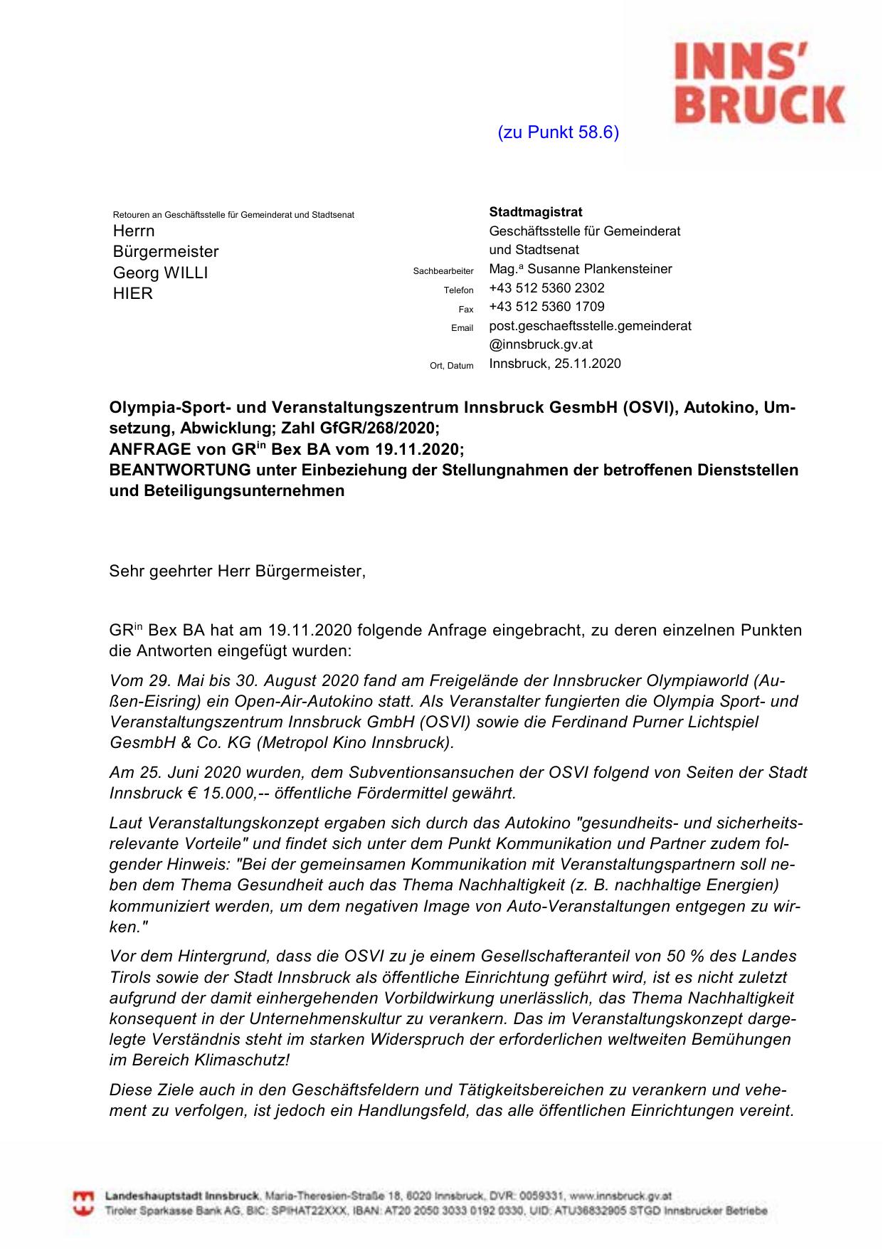 Olympia-Sport- und Veranstaltungszentrum Innsbruck GesmbH (OSVI), Autokino, Umsetzung, Abwicklung; Zahl GfGR/268/2020;