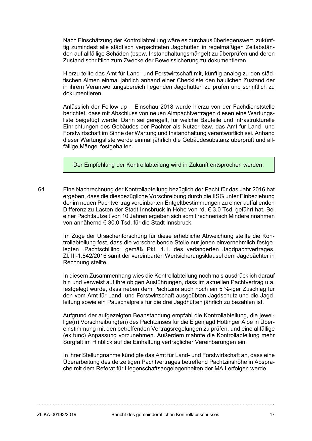 Aufgrund der aufgezeigten Beanstandung empfahl die Kontrollabteilung, die jeweilige(n) Vorschreibung(en) des Pachtzinses für die Eigenjagd Höttinger Alpe in Übereinstimmung mit den betreffenden Vertragsregelungen zu prüfen, und eine allfällige