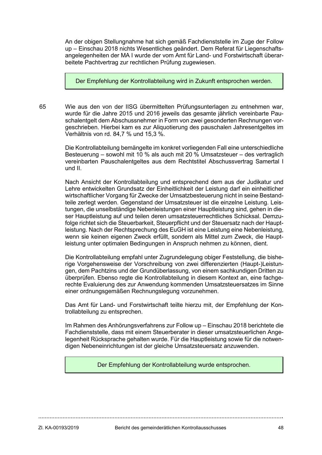Die Kontrollabteilung empfahl unter Zugrundelegung obiger Feststellung, die bisherige Vorgehensweise der Vorschreibung von zwei differenzierten (Haupt-)Leistungen, dem Pachtzins und der Grundüberlassung, von einem sachkundigen Dritten zu