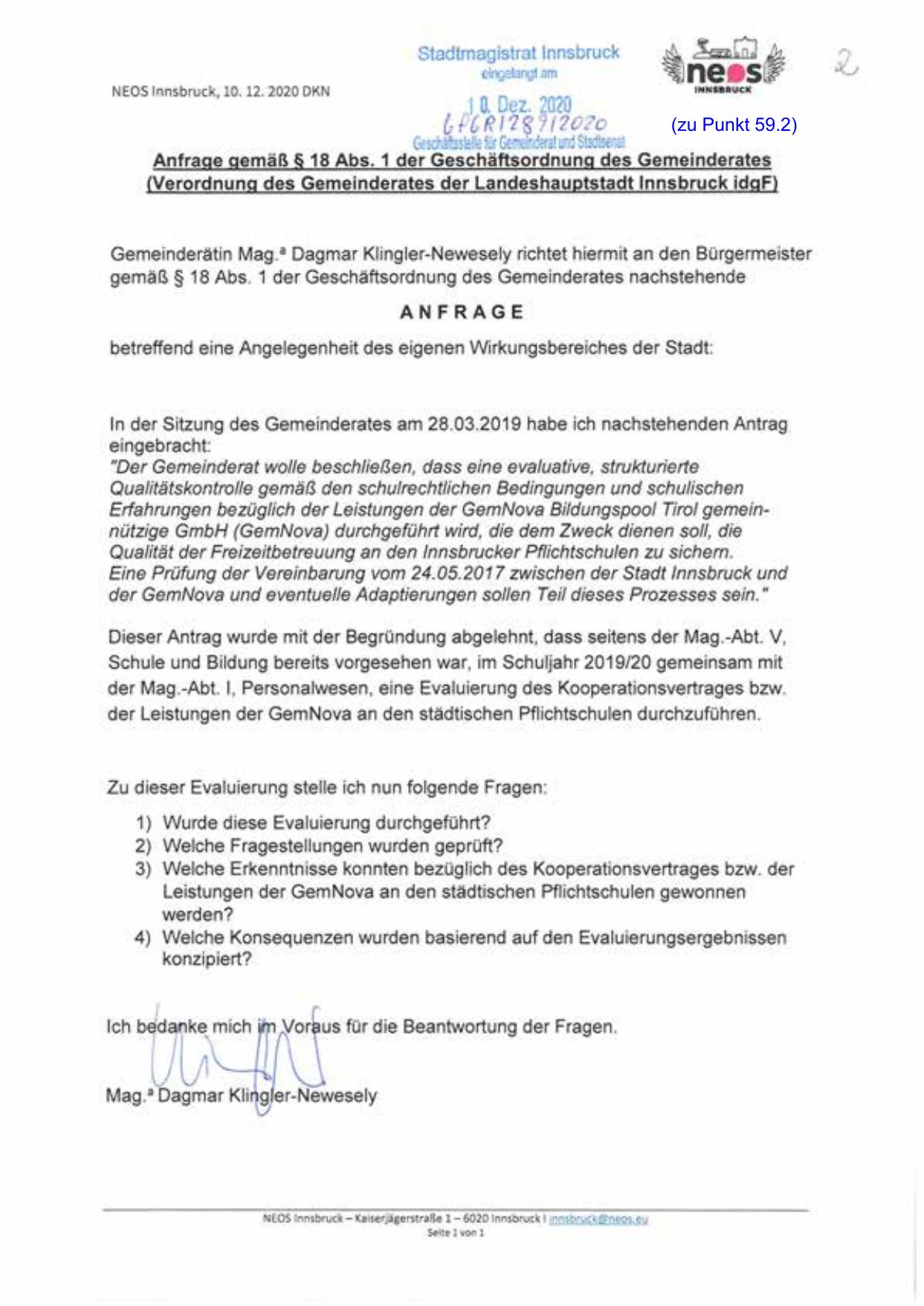 Gemeinderätin Mag.a Dagmar Klingler-Newesely richtet hiermit an den Bürgermeister