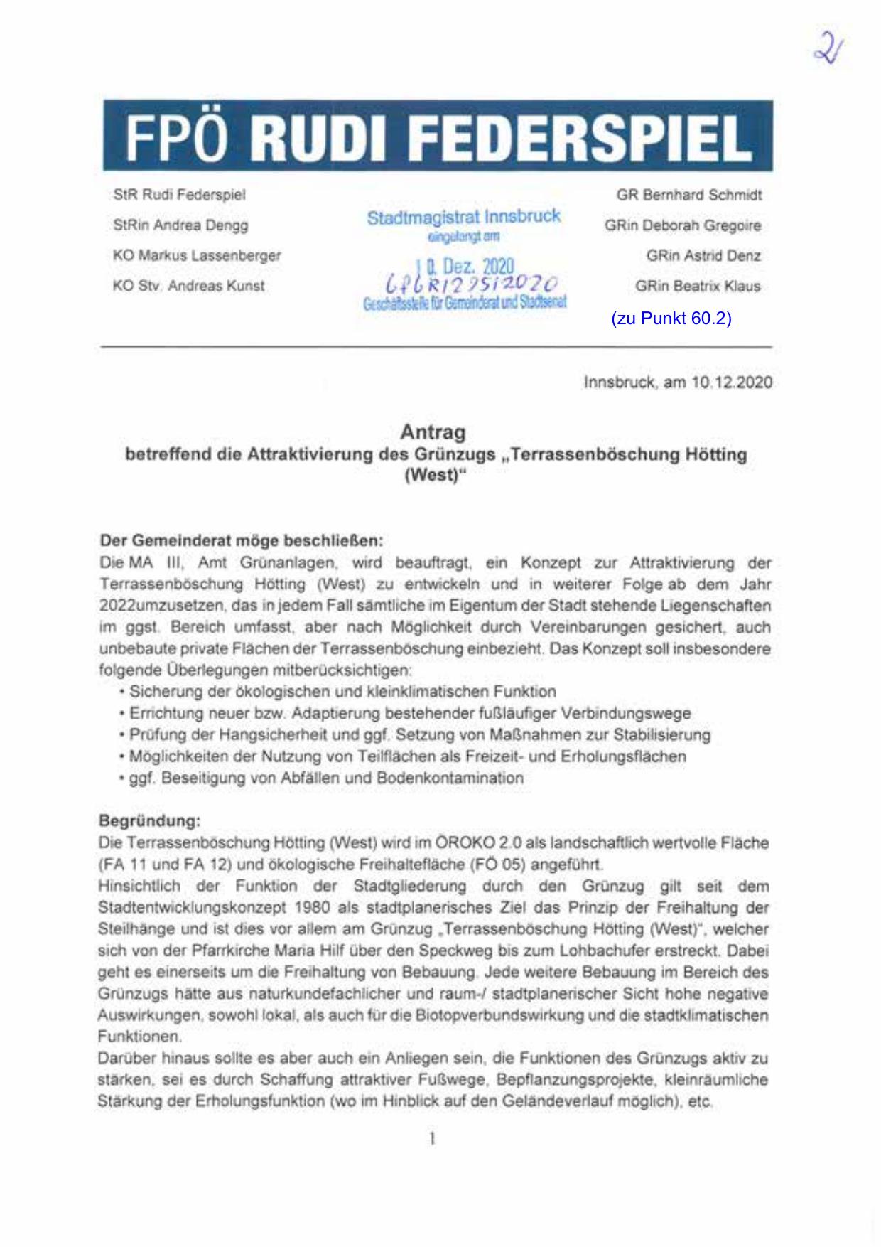 betreffend die Attraktivierung des Grünzugs „Terrassenböschung Hötting