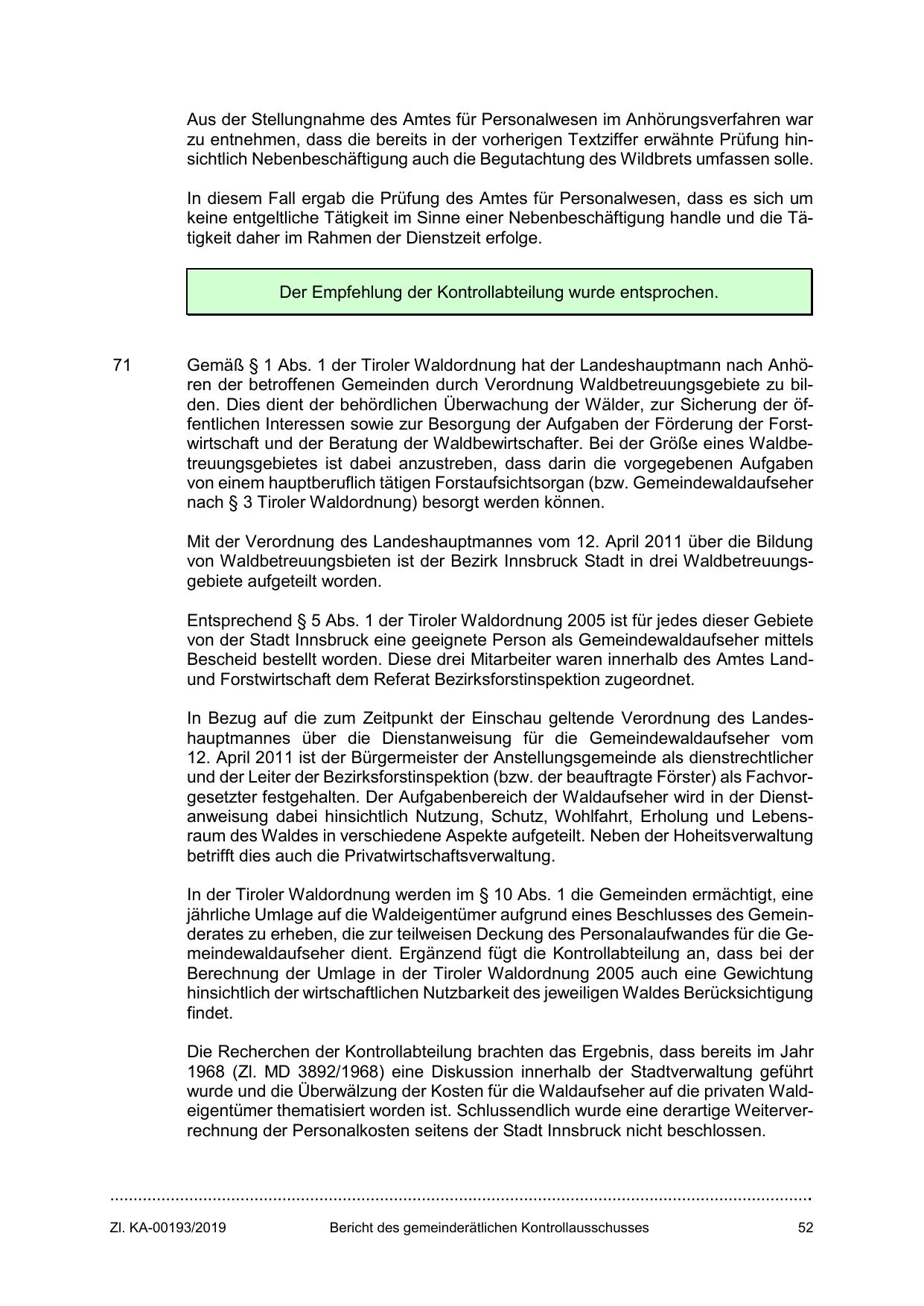 wurde und die Überwälzung der Kosten für die Waldaufseher auf die privaten Waldeigentümer thematisiert worden ist. Schlussendlich wurde eine derartige Weiterverrechnung der Personalkosten seitens der Stadt Innsbruck nicht beschlossen.