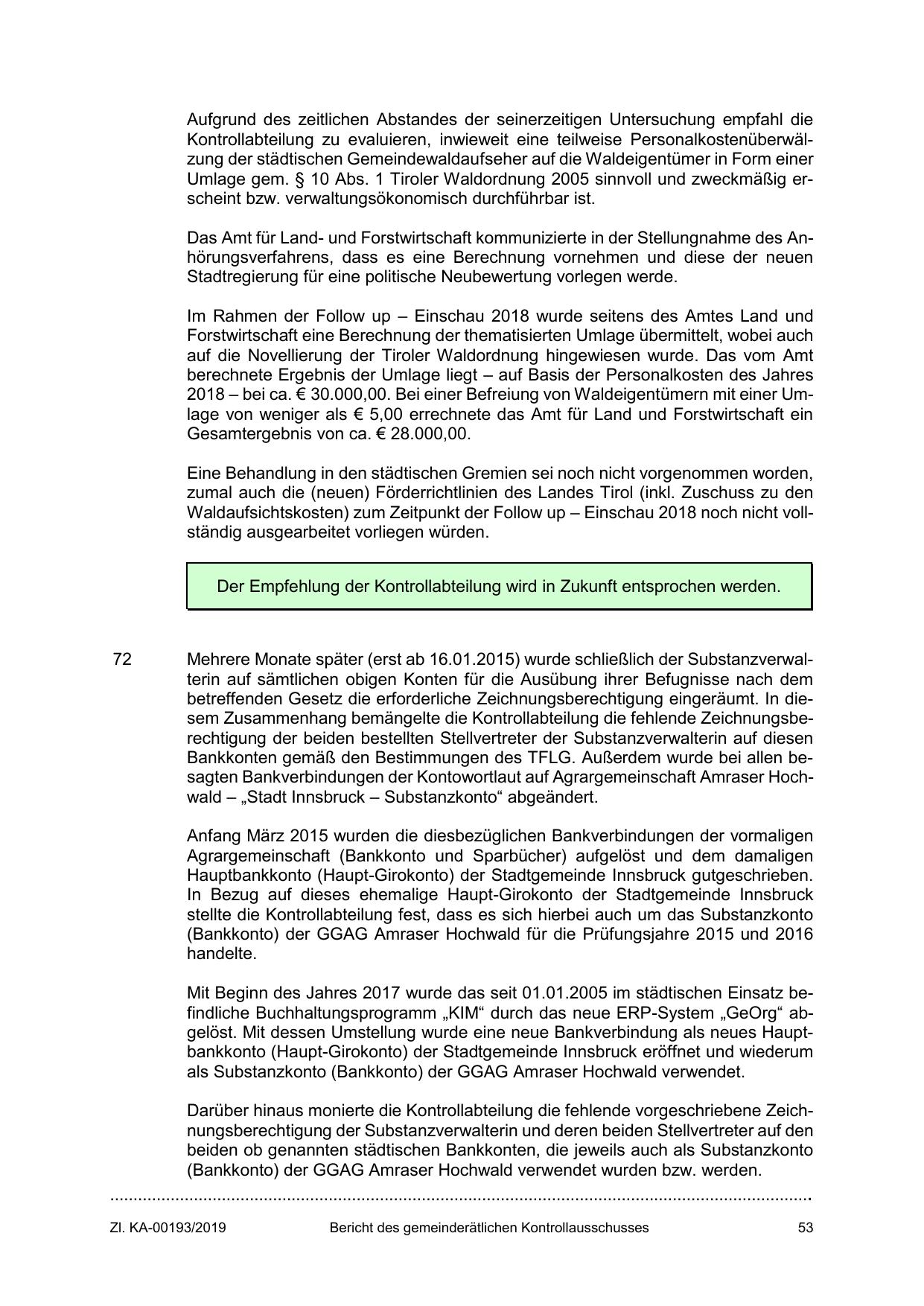 Bankkonten gemäß den Bestimmungen des TFLG. Außerdem wurde bei allen besagten Bankverbindungen der Kontowortlaut auf Agrargemeinschaft Amraser Hochwald – „Stadt Innsbruck – Substanzkonto“ abgeändert.