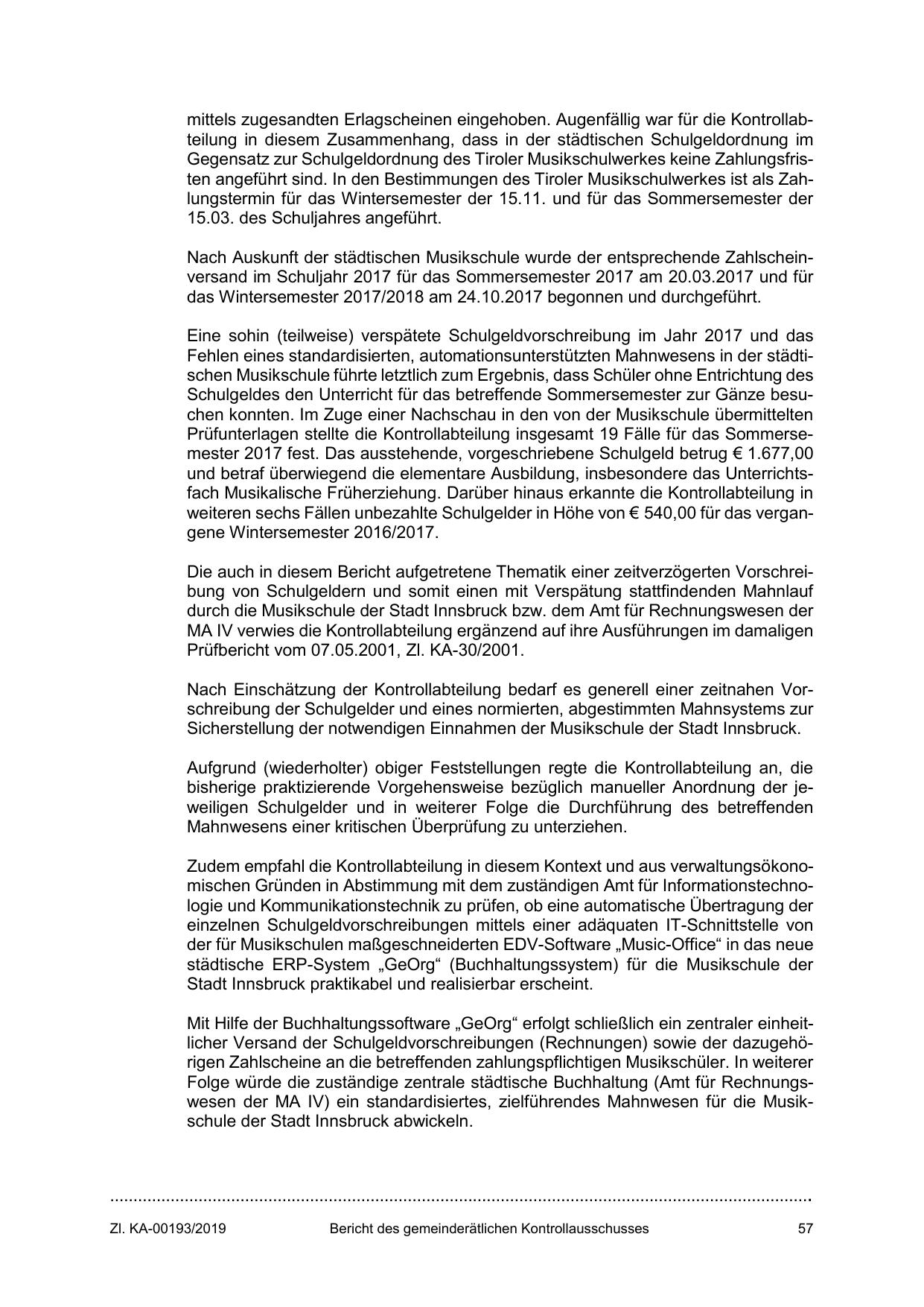 Folge würde die zuständige zentrale städtische Buchhaltung (Amt für Rechnungswesen der MA IV) ein standardisiertes, zielführendes Mahnwesen für die Musikschule der Stadt Innsbruck abwickeln.