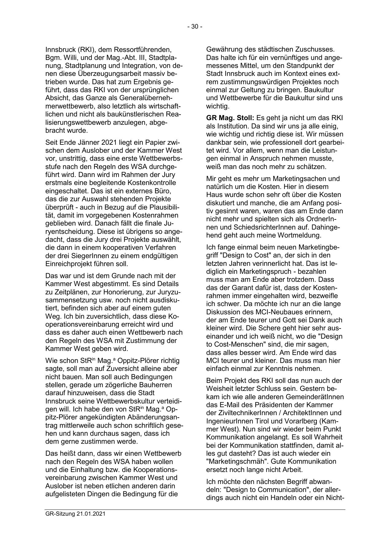 Innsbruck seine Wettbewerbskultur verteidigen will. Ich habe den von StRin Mag.a Oppitz-Plörer angekündigten Abänderungsantrag mittlerweile auch schon schriftlich gesehen und kann durchaus sagen, dass ich