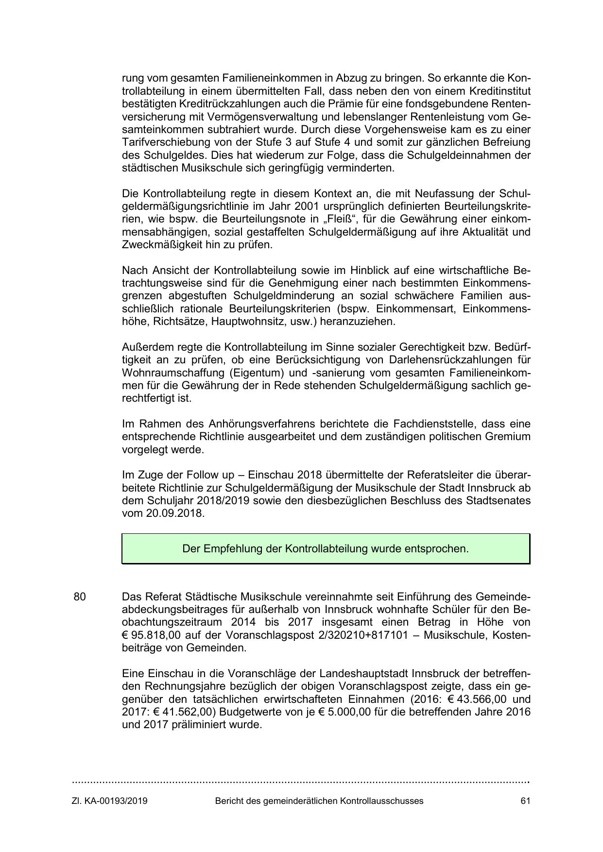 Im Zuge der Follow up – Einschau 2018 übermittelte der Referatsleiter die überarbeitete Richtlinie zur Schulgeldermäßigung der Musikschule der Stadt Innsbruck ab