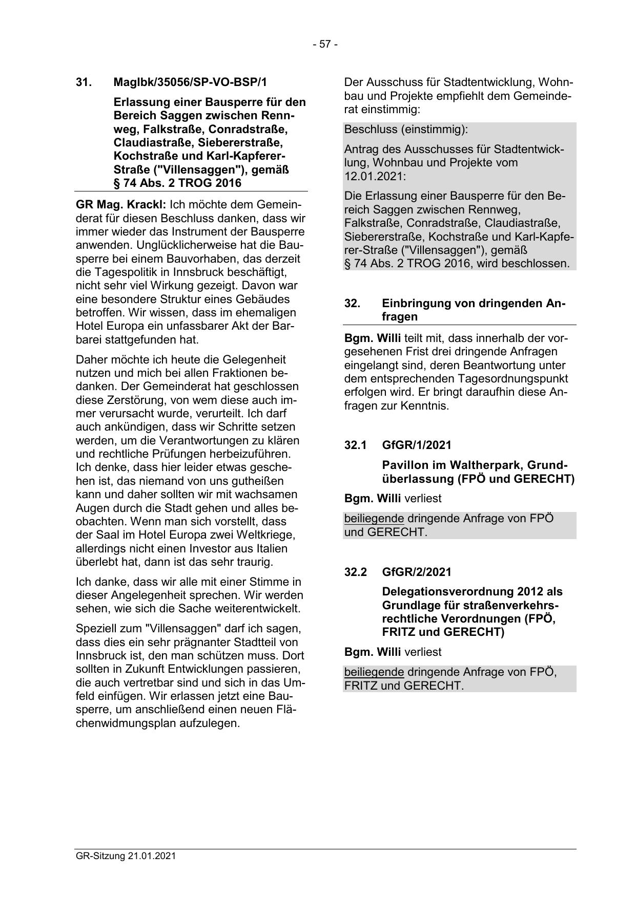 Bgm. Willi teilt mit, dass innerhalb der vorgesehenen Frist drei dringende Anfragen