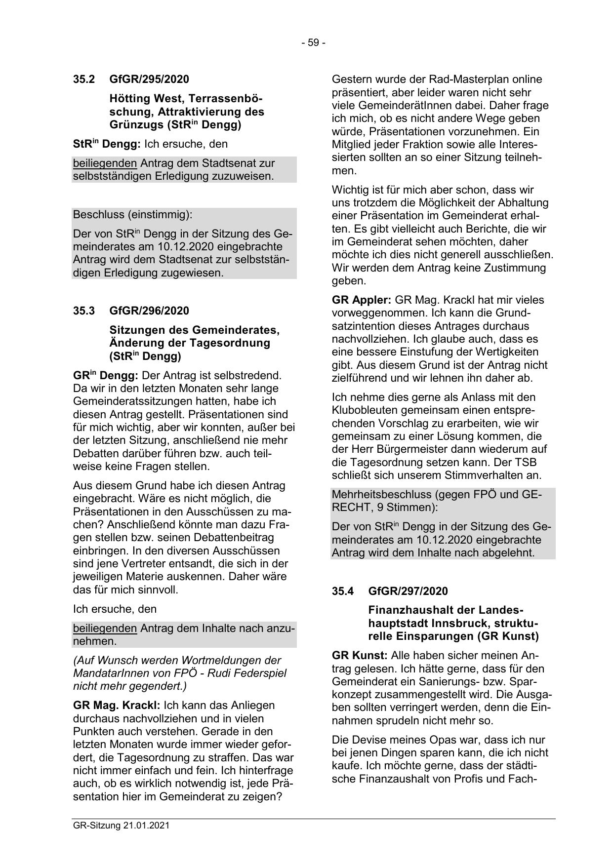 Der von StRin Dengg in der Sitzung des Gemeinderates am 10.12.2020 eingebrachte