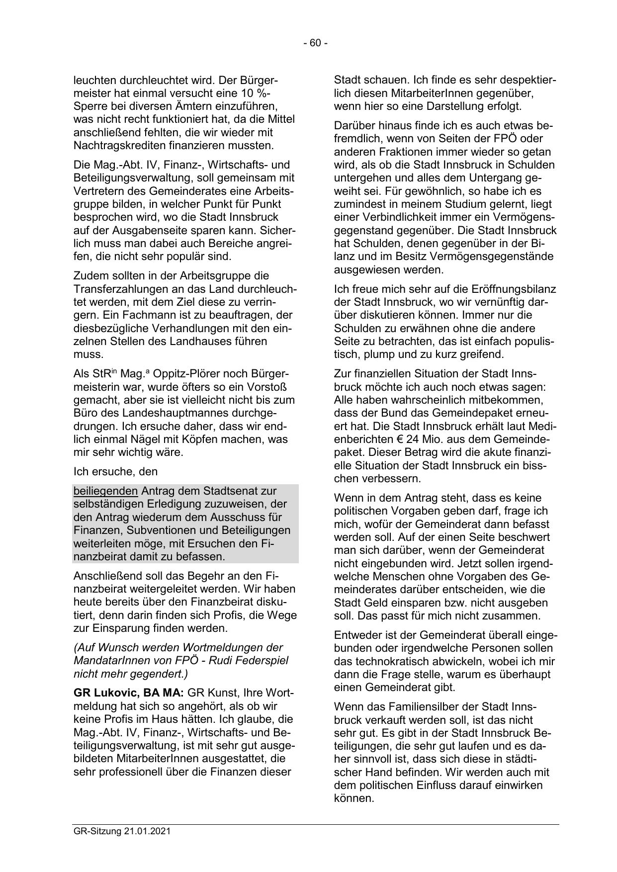 dass der Bund das Gemeindepaket erneuert hat. Die Stadt Innsbruck erhält laut Medienberichten € 24 Mio. aus dem Gemeindepaket. Dieser Betrag wird die akute finanzielle Situation der Stadt Innsbruck ein bisschen verbessern.