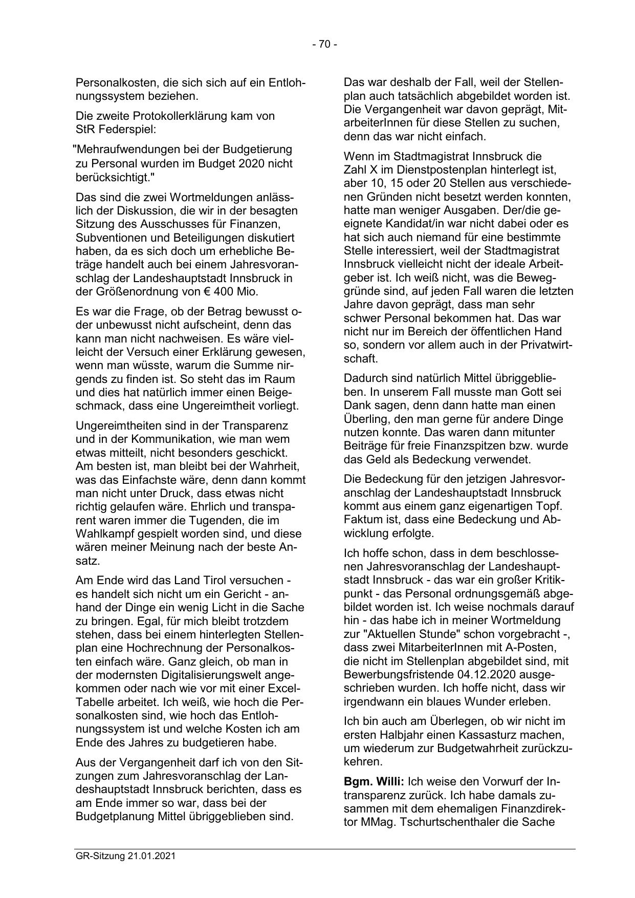 Ich hoffe schon, dass in dem beschlossenen Jahresvoranschlag der Landeshauptstadt Innsbruck - das war ein großer Kritikpunkt - das Personal ordnungsgemäß abgebildet worden ist. Ich weise nochmals darauf