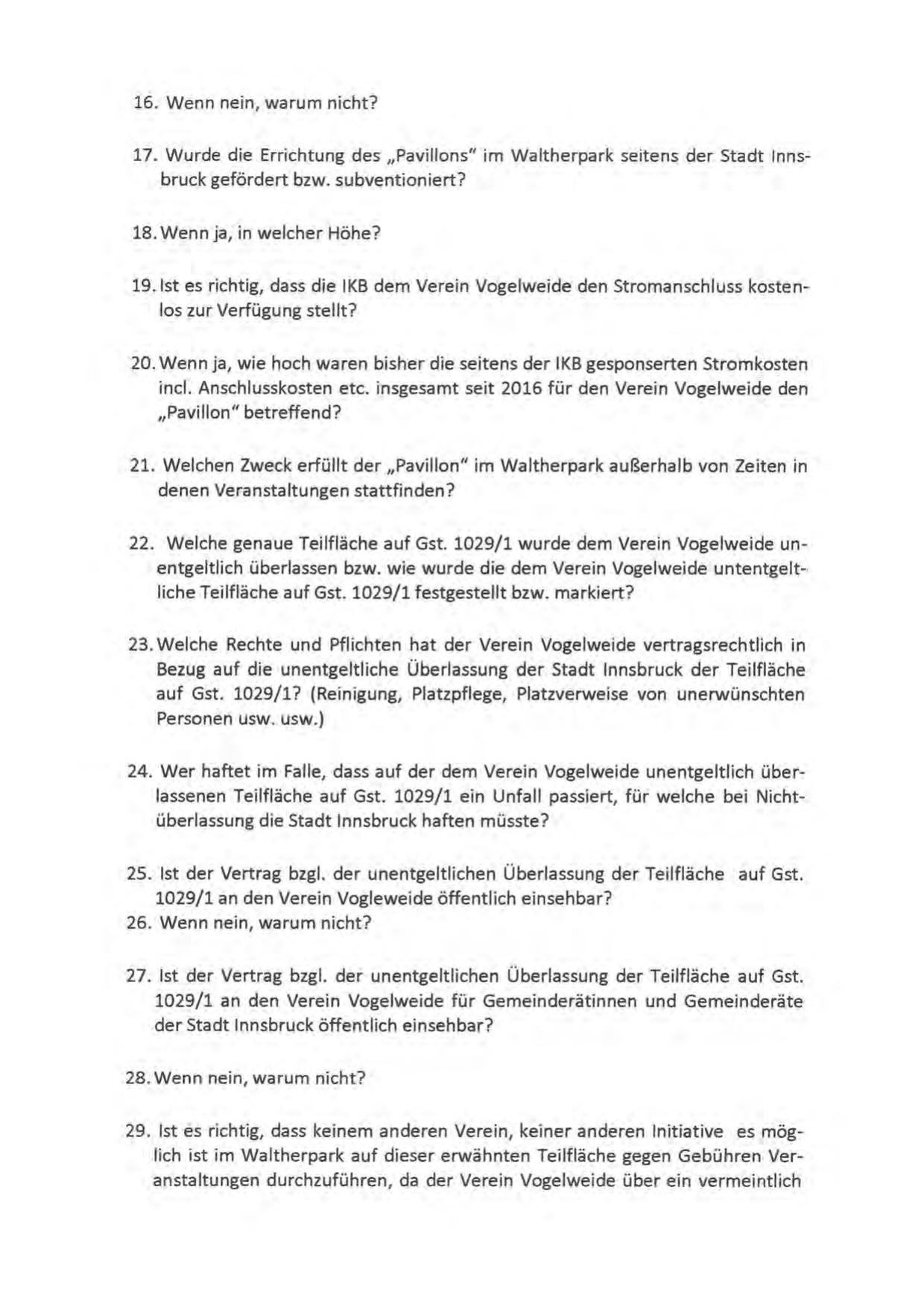 17. Wurde die Errichtung des „Pavillons" im Waltherpark seitens der Stadt Innsbruck gefördert bzw. subventioniert?