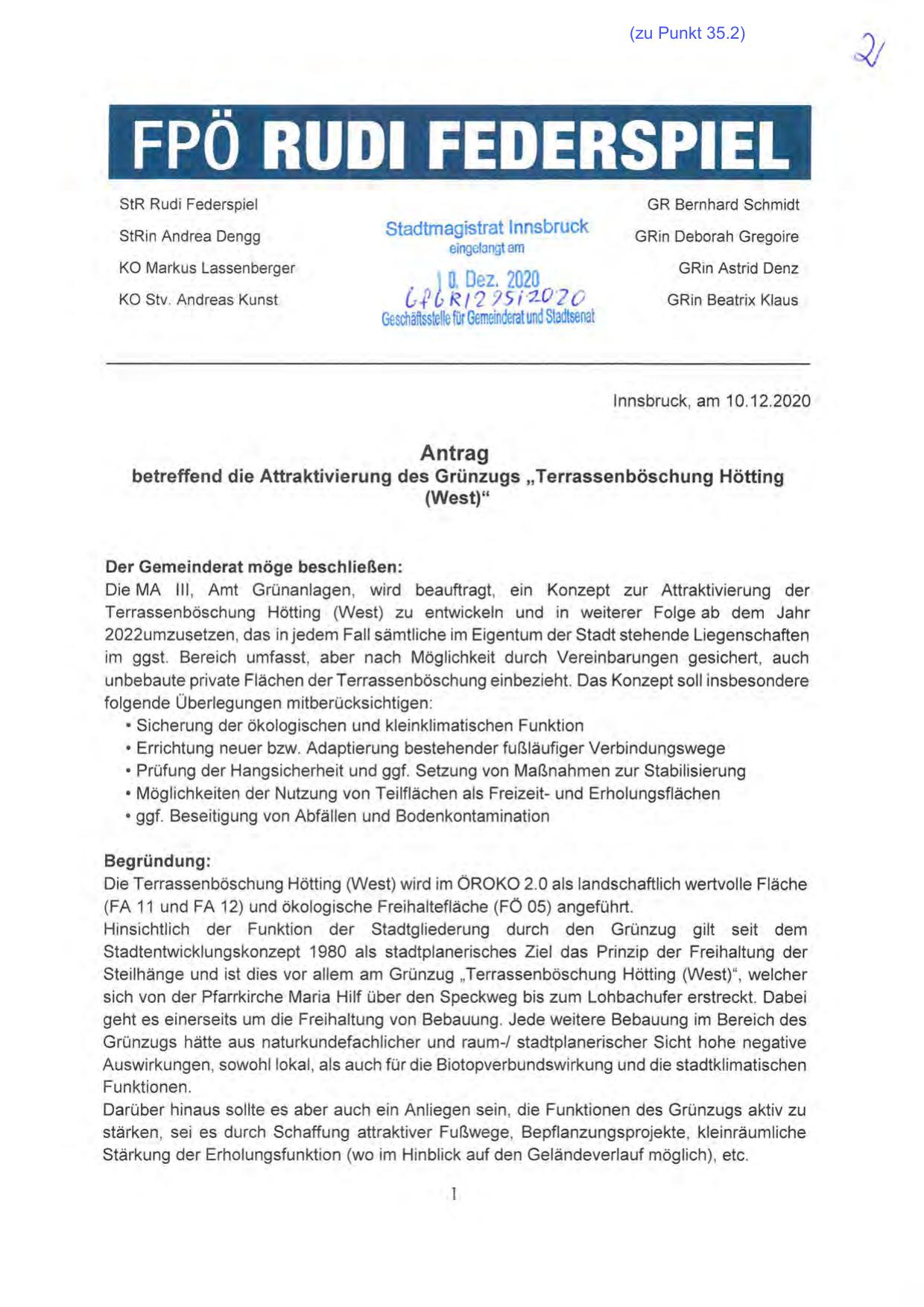 betreffend die Attraktivierung des Grünzugs „Terrassenböschung Hötting